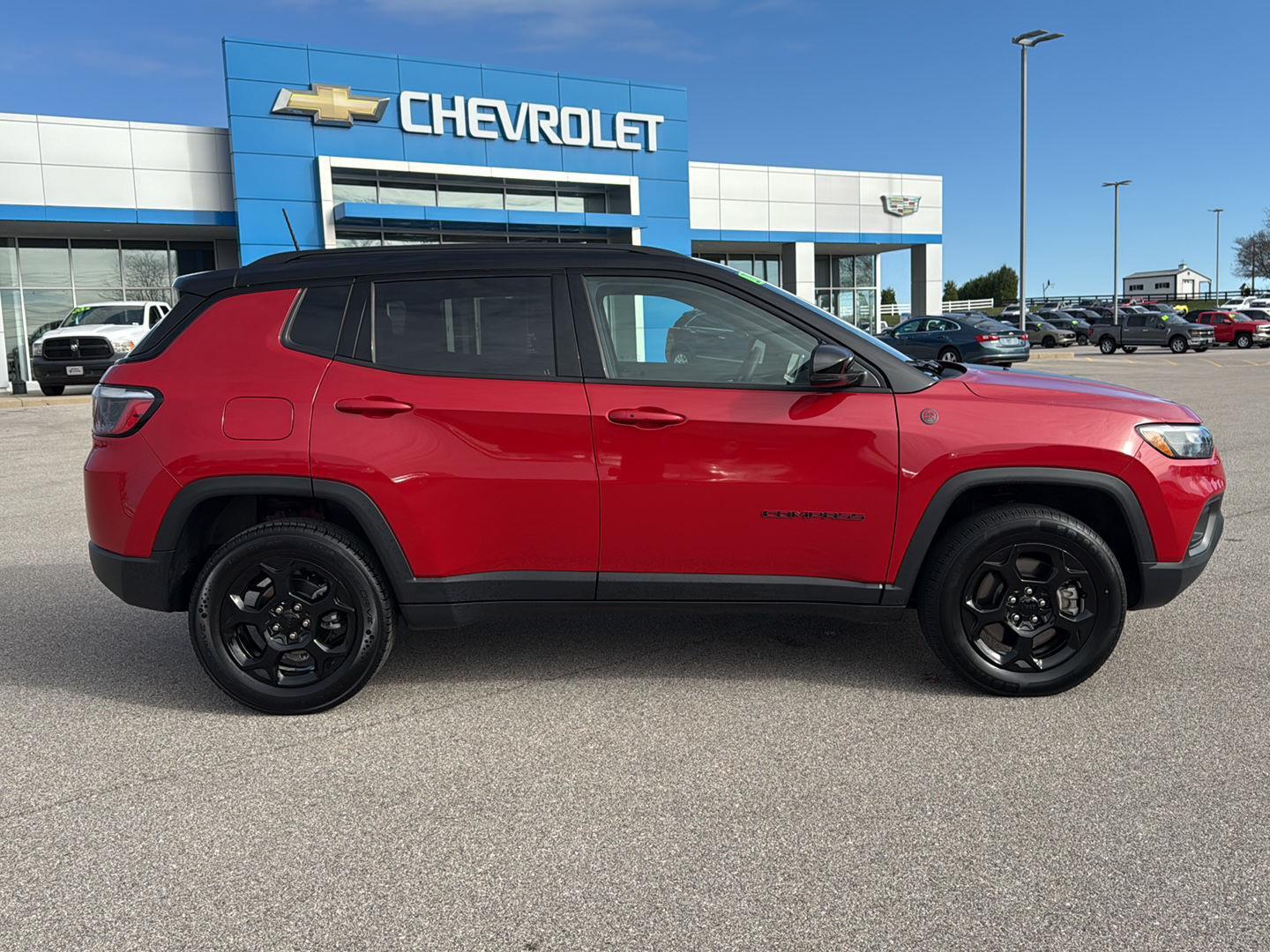 2023 Jeep Compass Trailhawk - Now Available at John Jones Chevrolet of Salem in Salem, IN! This 2023 Jeep Compass Trailhawk with 4 wheel drive in "Redline Pearl" with "Black/Ruby Red" interior features a 2.0L engine and an 8 speed automatic transmission. Includes dual zone automatic climate control, tilt/telescoping steering column, remote entry, reverse camera, and more. Safety features include adaptive cruise control, lane departure warning, blind spot and cross path detection, forward collision warning, and rain sensing front wipers. See it at John Jones Auto Group! One Owner! No Accidents!