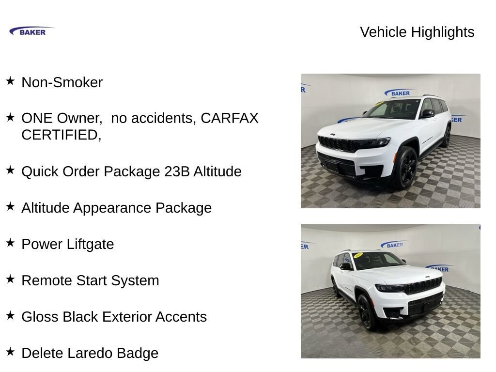 New Price! Bright White Clearcoat 2023 Jeep Grand Cherokee L Altitude 4WD 8-Speed Automatic 3.6L V6 24V VVT Non-Smoker, one owner, no accidents, CARFAX certified. Grand Cherokee L Altitude, 4D Sport Utility, 3.6L V6 24V VVT, 8-Speed Automatic, 4WD, Bright White Clearcoat, Global Black Artificial Leather. Odometer is 19681 miles below market average!