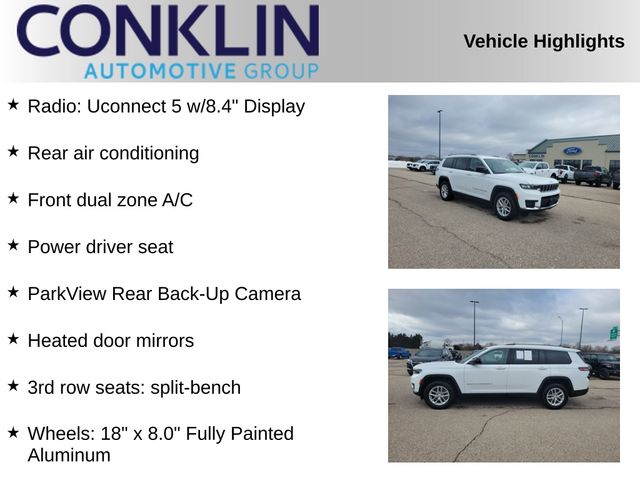 Drive Forever limited lifetime engine and transmission protection on all eligible new and used vehicles. Every new and Conklin-Certified used vehicle includes a complimentary rental vehicle when you have any Service completed for three full years. Every Conklin-Certified used vehicle is backed by a 3-day buyback guarantee. Conklin Automotive Newton New and Used Car Dealership near Wichita Kansas. This 2023 Jeep Grand Cherokee L Laredo is a versatile and capable SUV that offers the perfect blend of style, comfort, and performance. With its striking white/off-white exterior and a well-equipped interior, this Grand Cherokee L is ready to take on any adventure. Under the hood, the 3.6L V6 engine, paired with an 8-Speed transmission, delivers a smooth and confident driving experience. With 4WD capabilities, this vehicle is ready to tackle any terrain, whether it's a snowy commute or a rugged off-road excursion. Fuel efficiency is also a highlight, with an EPA-estimated 18 MPG in the city and 25 MPG on the highway, making this SUV a practical choice for both daily driving and long-distance travels.