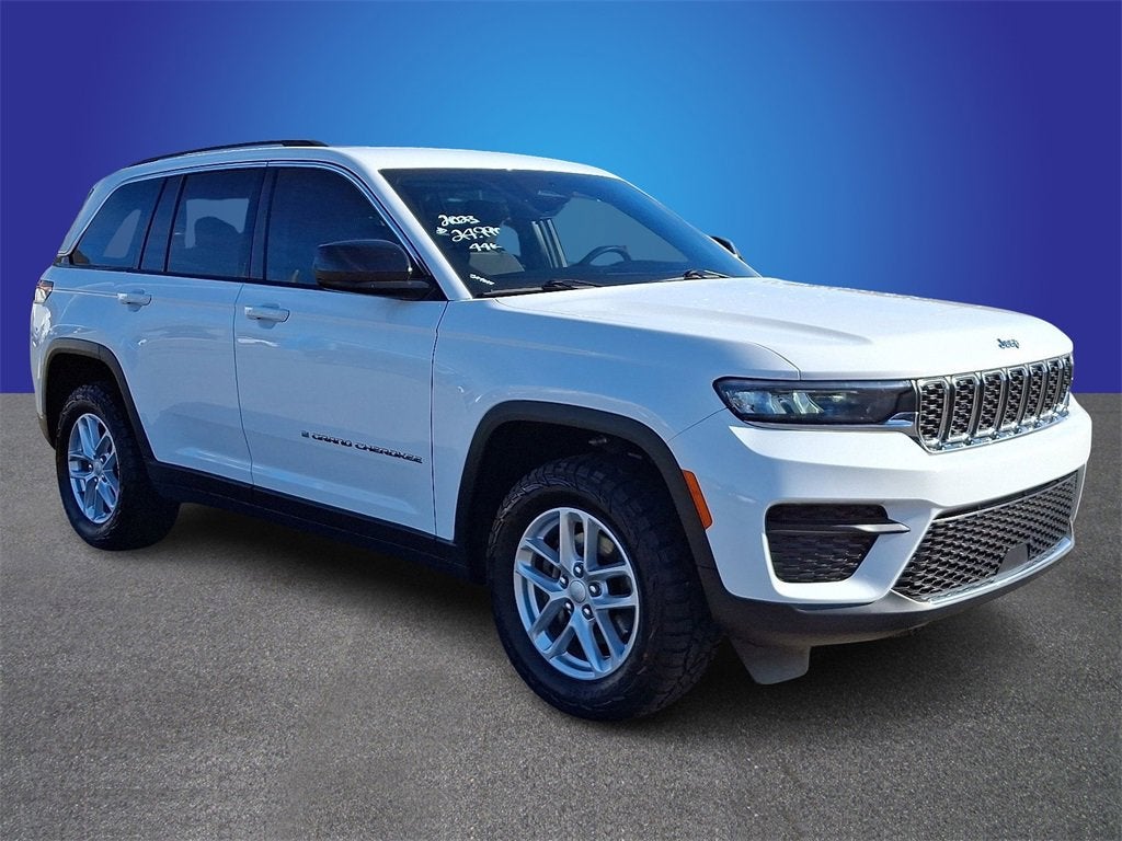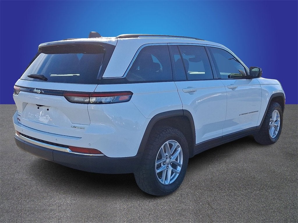 Bright White Clearcoat 2023 Jeep Grand Cherokee Laredo 4WD 8-Speed Automatic 3.6L V6 24V VVT 4WD, 115V Auxiliary Power Outlet, 3.45 Rear Axle Ratio, 4-Wheel Disc Brakes, 6 Speakers, ABS brakes, Air Conditioning, Alloy wheels, Anti-whiplash front head restraints, Automatic temperature control, Brake assist, Bumpers: body-color, Cloth Seats, Compass, Delay-off headlights, Driver door bin, Driver vanity mirror, Dual front impact airbags, Dual front side impact airbags, Electronic Stability Control, Emergency communication system, Four wheel independent suspension, Front anti-roll bar, Front Bucket Seats, Front Center Armrest w/Storage, Front dual zone A/C, Front reading lights, Fully automatic headlights, Heated door mirrors, Heated Front Seats, Heated Steering Wheel, Illuminated entry, Knee airbag, Low tire pressure warning, Luxury Tech Group I, Molded In Color Black/Gloss Black Roof Rails, Normal Duty Suspension, Occupant sensing airbag, Outside temperature display, Overhead airbag, Overhead console, Panic alarm, ParkView Rear Back-Up Camera, Passenger door bin, Passenger vanity mirror, Power door mirrors, Power driver seat, Power Liftgate, Power steering, Power windows, Quick Order Package 23A Laredo, Radio data system, Radio: Uconnect 5 w/8.4 Display, Rain Sensitive Windshield Wipers, Rear anti-roll bar, Rear reading lights, Rear window defroster, Rear window wiper, Remote keyless entry, Remote Start System, Secondary Active Grille Shutters, Security system, Selectable Tire Fill Alert, Speed control, Speed-Sensitive Wipers, Split folding rear seat, Spoiler, Steering wheel mounted audio controls, Tachometer, Telescoping steering wheel, Tilt steering wheel, Traction control, Trip computer, Variably intermittent wipers, Voltmeter, Wheels: 17 x 6.5 Fully Painted Aluminum, Wheels: 18 x 8 Fully Painted Aluminum (DISC), Wireless Charging Pad.