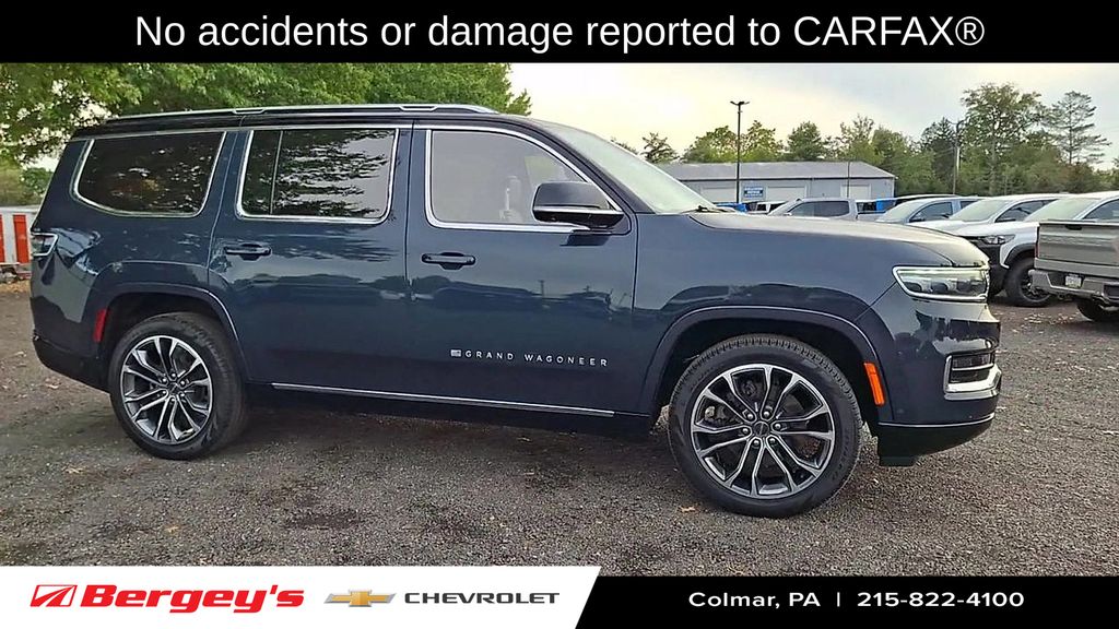 Get ready to turn heads in Montgomery County with the luxurious and powerful 2023 Jeep Grand Wagoneer Series III now fit for your premium lifestyle in Colmar, Doylestown, Sellersville and beyond! This top tier SUV boasts a twin turbo 3.0L inline6 engine delivering 510hp and 500lbft of torque, paired with an 8 speed automatic and fulltime 4WD for serious performance. Inside, it comes packed with luxury SUV touches: seating for 78, high end leather and trim, a mega 23 speaker premium audio system, passenger side infotainment screen, night vision pedestrian/animal detection, active driving assist, and a digital rearview mirror all standard in Series III. Whether you're cruising through Colmar errands, heading out for a weekend escape from Sellersville into the Poconos, or managing family shuttle duty in Doylestown, this Grand Wagoneer Series III blends commanding presence, premium comfort and tech rich functionality into one incredible package.