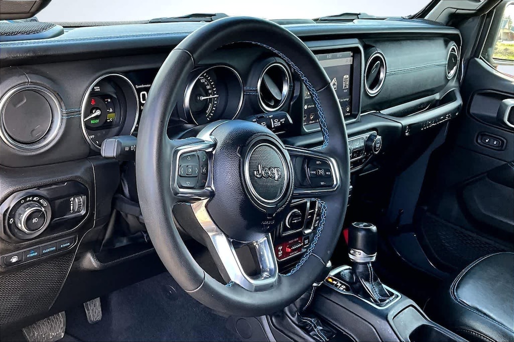 Sting-Gray Clearcoat 2023 Jeep Wrangler Rubicon 20th Anniversary Edition 4xe 4WD is a highly capable plug-in hybrid Wrangler that combines trail-rated off-road performance with modern electrified efficiency. Powered by a 2.0L I4 DOHC engine paired with Jeep's 4xe hybrid system and an 8-speed automatic transmission, it delivers instant torque for confident crawling, towing, and everyday driving across the Pacific Northwest. As a Rubicon 20th Anniversary Edition, this Wrangler is purpose-built for serious off-road capability while adding exclusive styling and premium features. The Sky 1-Touch Power Top provides open-air freedom at the push of a button, complemented by removable rear quarter windows and a power top quarter window storage bag for flexibility in changing conditions. Whether you’re cruising through the city or exploring mountain trails, this Wrangler adapts quickly to your environment. Inside, comfort meets technology with heated front seats, a heated steering wheel, and dual-zone automatic climate control—ideal for year-round driving. The navigation system and ParkView rear back-up camera enhance confidence and convenience, while the Rubicon’s interior maintains a durable, functional design suited for both daily use and off-road excursions.