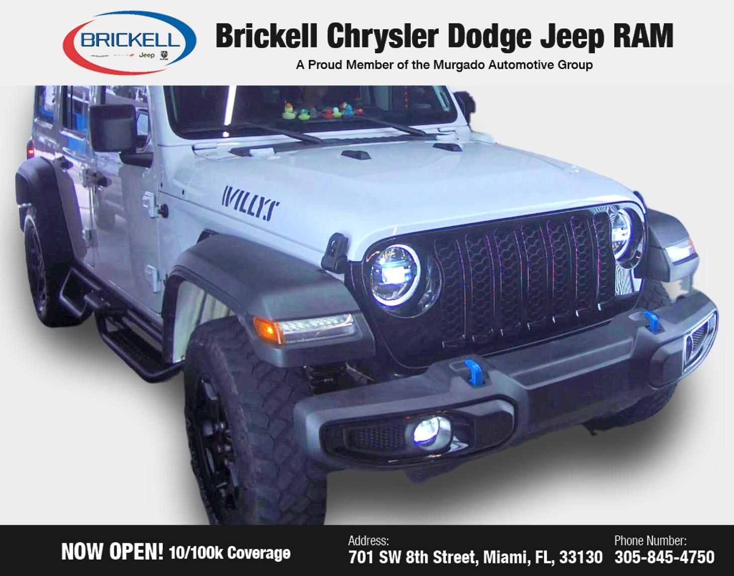 Unleash the off-road prowess of the 2023 Jeep Wrangler Base 4xe. This electrified SUV is ready to conquer any terrain while delivering exceptional efficiency and uncompromising capability. Boasting a robust 2.0L I4 DOHC engine paired with an 8-speed automatic transmission and 4-wheel drive, the Wrangler 4xe is engineered to tackle the toughest challenges. Elevate your adventures with the Sun & Screen Package, featuring a power Sky 1-Touch top, 8.4" Uconnect 4C Nav system, and a host of premium amenities. The Convenience Group adds the convenience of a universal garage door opener, ensuring seamless integration into your daily life. Experience the perfect blend of off-road capability and modern technology in the 2023 Jeep Wrangler Base 4xe. This electrified icon is ready to elevate your driving experience, whether you're conquering the trails or navigating the city streets. At Brickell CDJR, we make buying a pre-owned vehicle easy and stress-free. Every pre-owned vehicle is thoroughly inspected to ensure quality and reliability. For added confidence, we include a 10-year/100,000-mile powertrain warranty on all non-European brands at no additional cost. Our dealership offers one of the largest selections of pre-owned inventory in the region, so you can find the right car, truck, or SUV for your needs. Our state-of-the-art service department, the largest in the country, is open seven days a week from 7 AM to 9 PM, ensuring your vehicle stays in top condition.