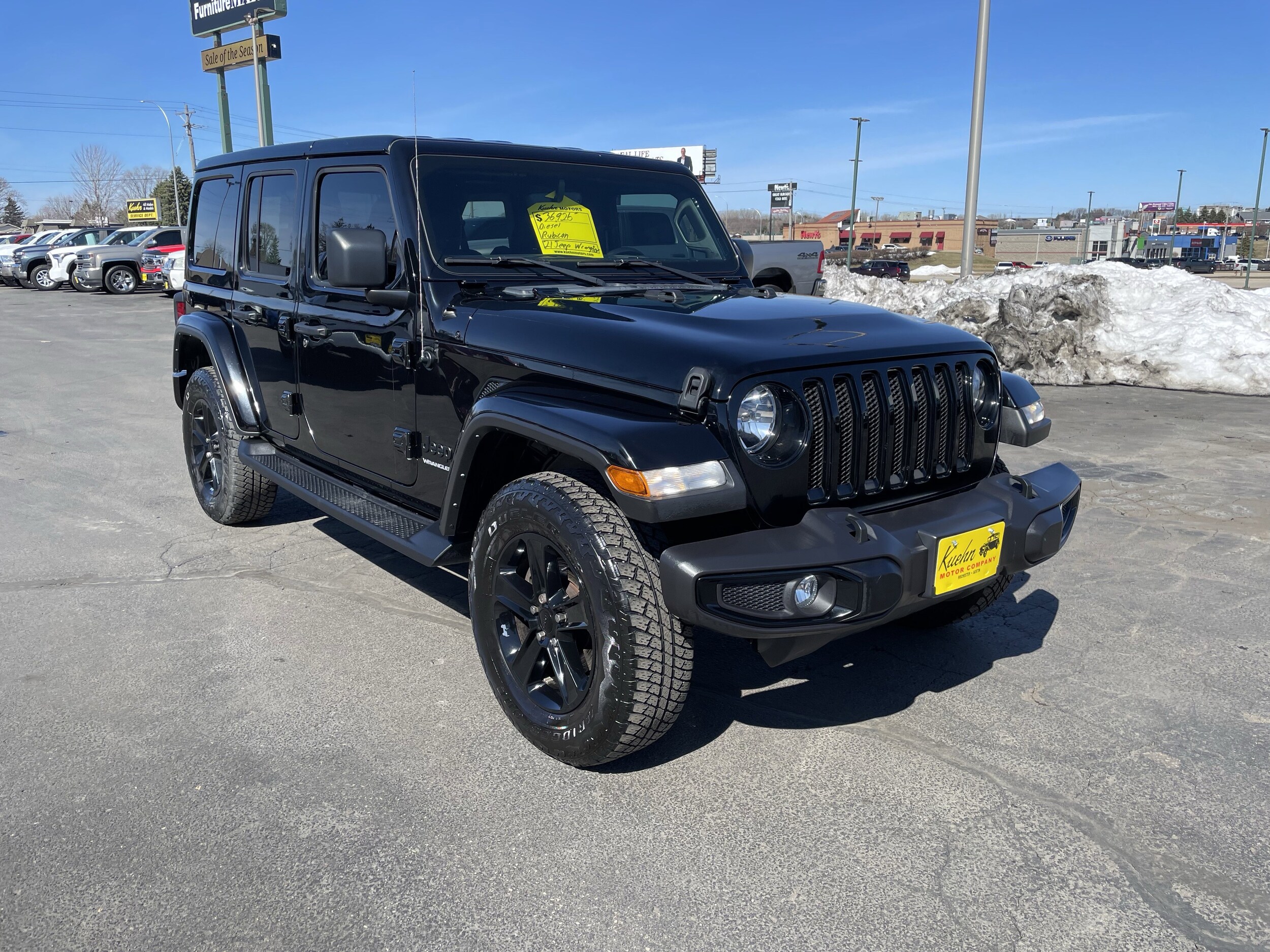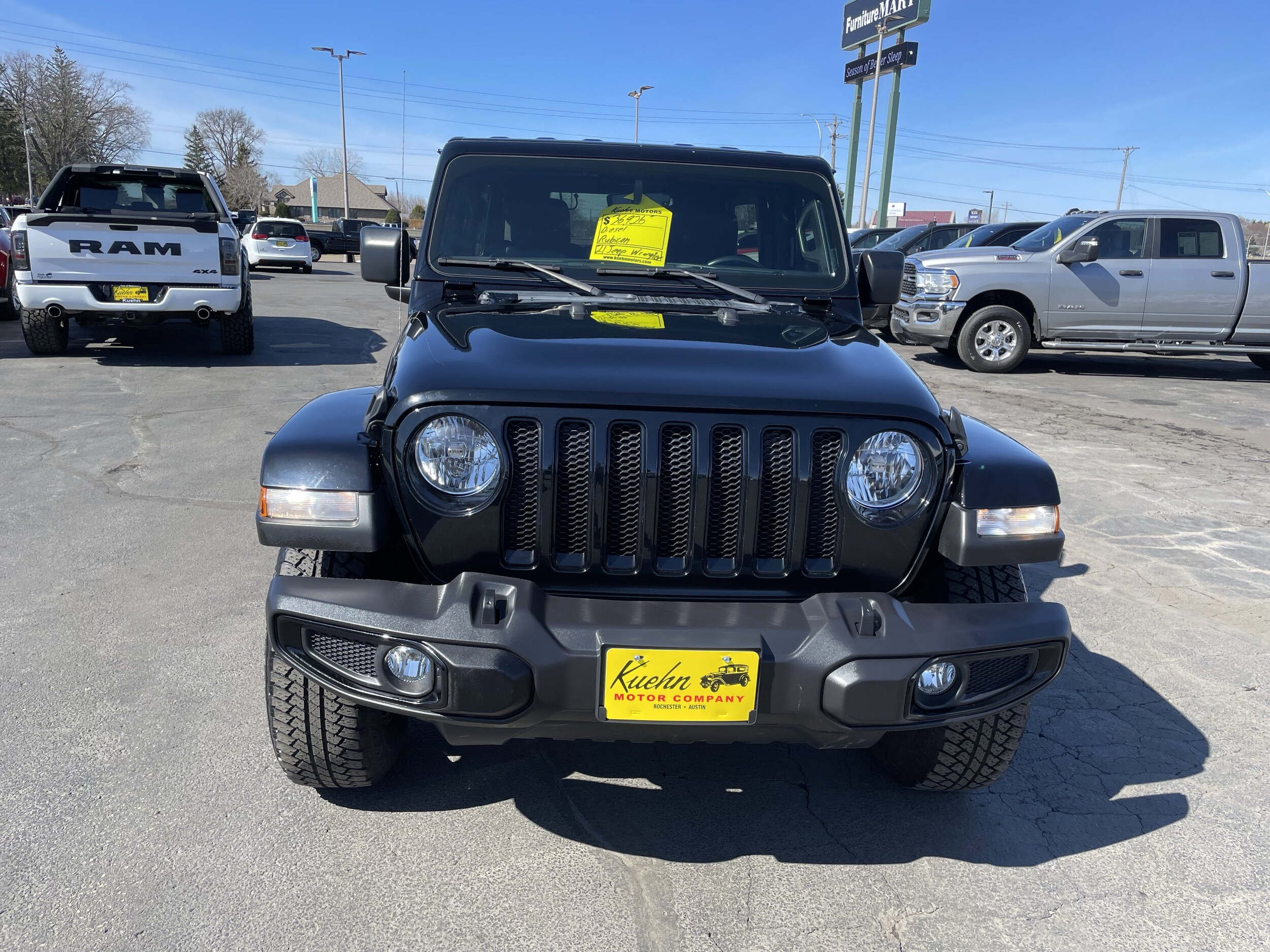 This Jeep Wrangler has a strong Intercooled Turbo Premium Unleaded I-4 2.0 L/122 engine powering this automatic transmission. Transmission: 8-Speed Automatic (850RE) -inc: Selec-Speed Control (STD), Quick Order Package 22L Altitude -inc: Engine: 2.0L I4 DOHC DI Turbo w/ESS, Transmission: 8-Speed Automatic (850RE), Mold In Color Bumper w/Gloss Black, Leather Wrapped Shift Knob, Freedom Panel Storage Bag, Rear Window Defroster, Rear Window Wiper/Washer, No Soft Top, Altitude Package, #1 Seat Foam Cushion, 110 MPH Vehicle Max Speed Calibration, Body Color Grille w/Gloss Black Rings, Black Interior Accents, Gray/Black Trail Rated Badge, Wizard Black Instrument Panel Bezels, Matte Black Jeep Badge, Leather Wrapped Park Brake Handle, Bridgestone Brand Tires, GVWR: 5,500 LBS (STD), Engine: 2.0L I4 DOHC DI Turbo w/ESS (STD), Cold Weather Group -inc: Heated Steering Wheel, Remote Start System, Heated Front Seats. This Jeep Wrangler comes equipped with these options. Black, leather trimmed bucket seats (GL), Black Clearcoat, Wireless Phone Connectivity, Wheels: 18 x 7.5 Gloss Black Aluminum Late availability., Variable Intermittent Wipers, Trip Computer, Transmission: 8-Speed Automatic (850RE) -inc: Selec-Speed Control, Transmission w/Sequential Shift Control w/Steering Wheel Controls, Tracker System, Towing Equipment -inc: Trailer Sway Control, Tires: 255/70R18 All Terrain Late availability., Tire Specific Low Tire Pressure Warning, Tailgate/Rear Door Lock Included w/Power Door Locks, Swing-Out Rear Cargo Access. Visit us today. Come in for a quick visit at Kuehn Motor Company, 5020 Highway 52 N., Rochester, MN 55901 to claim your Jeep Wrangler!