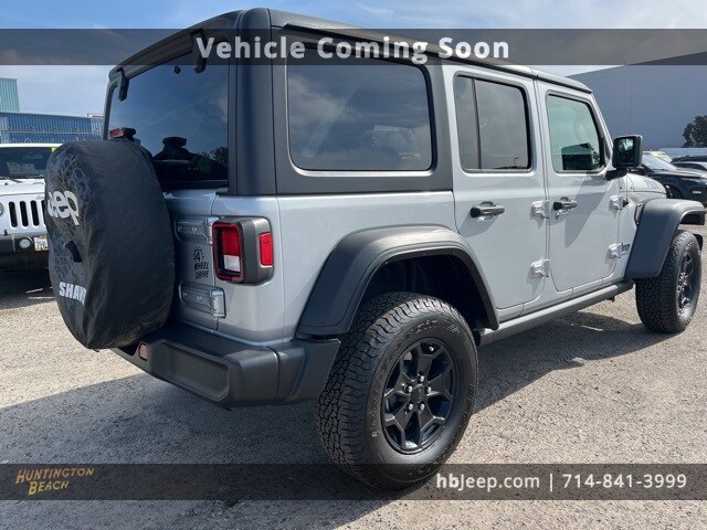 2023 Jeep Wrangler Silver Zynith Clearcoat 8-Speed Automatic 2.0L I4 DOHC Bluetooth wireless / hands free, back up camera, Apple CarPlay & Android Auto, 2.0L I4 DOHC, 4xe 4-Wheel Drive Swing Gate Decal, 97 MPH Vehicle Max Speed Calibration, ABS brakes, Alloy wheels, Anti-Spin Differential Rear Axle, Black 3-Piece Hard Top, Black Grille, Compass, Electronic Stability Control, Freedom Panel Storage Bag, Front dual zone A/C, Front LED Fog Lamps, Heated door mirrors, Illuminated entry, LED Headlamp & Fog Lamp Group, LED Premium Reflector Headlamps, Low tire pressure warning, Molded-In-Color Fender Flares (2-Piece), MOPAR All-Weather Floor Mats, Normal Duty Suspension, ParkView Rear Back-Up Camera, Passenger door bin, Quick Order Package 29W Willys, Rear Window Defroster, Rear Window Wiper/Washer, Remote keyless entry, Traction control, Wheels: 17" x 7.5" Black Aluminum, Willys, Willys 4xe Hood Decal. Odometer is 2164 miles below market average! This vehicle is coming soon, it may not be available for show or test drive. This vehicle is going through a safety inspection and if necessary a smog test. Pending inspection, vehicle may not become available for sale. We are located at: 16701 Beach Blvd, Huntington Beach, CA 92647.