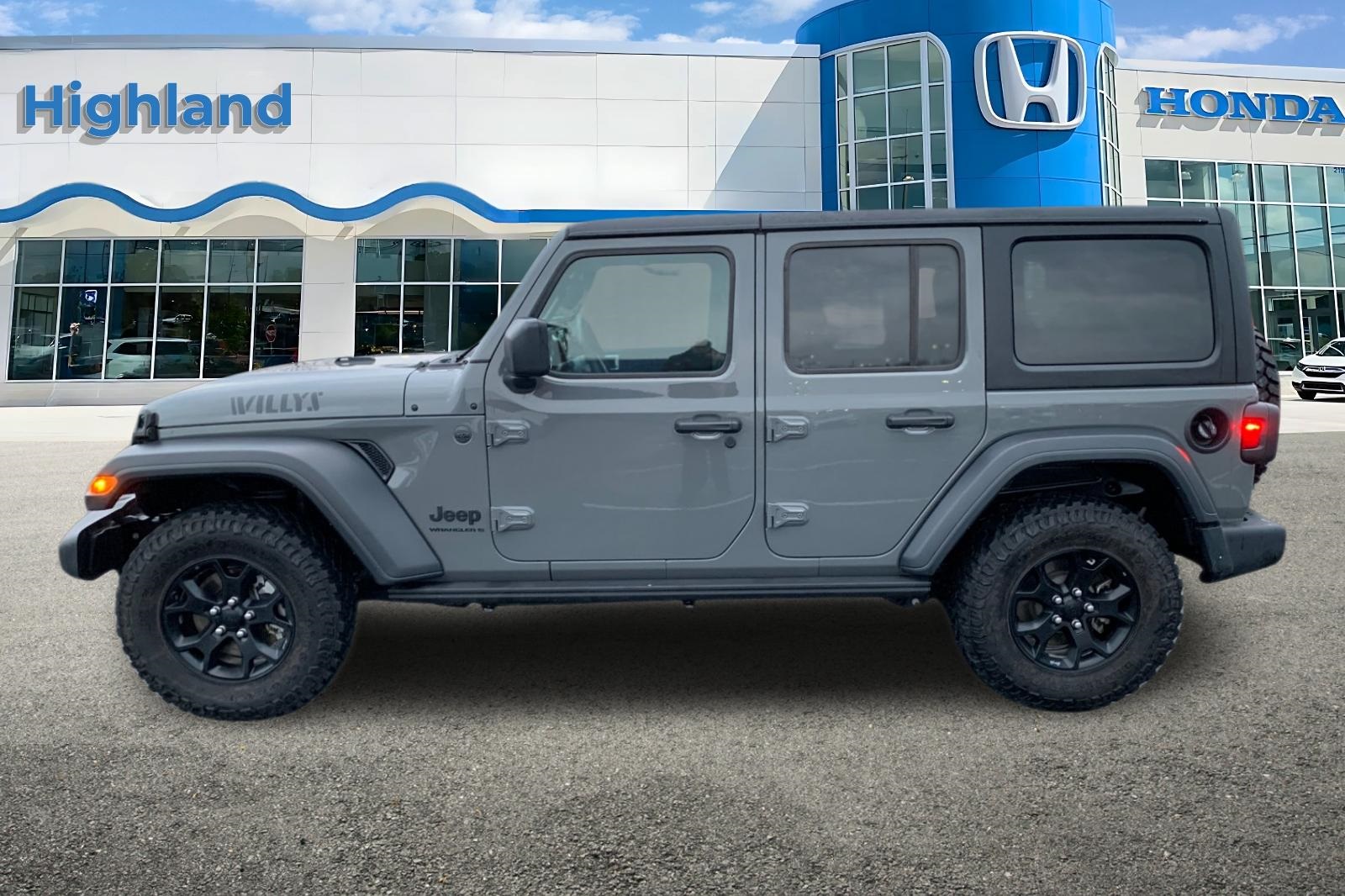 This 2023 Jeep Wrangler Willys vehicle was recently traded in by our store here in Highland. Crown Point driven and maintained. Ready for its next driver to take it on more adventures! This Beauty has had and passed an extensive 182 Multi-Point Inspection conducted by our Honda factory certified technicians. All necessary services have been done for the appropriate mileage interval. CARFAX One-Owner. Clean CARFAX. Buy with confidence as each of our Pre-Owned Vehicles come equipped with a 90-Day/3000 Mile warranty as well as Car Doc, our exclusive maintenance and membership program. The included Car Doc Program comes with 6 Complimentary Oil Changes and 6 Complimentary Tire Rotations for the first TWO years of car ownership. Also, this vehicle is available to upgrade to a 3 Year or 5 Year Car Doc along with other perks to give you peace of mind when it comes to your driving experience. It's just what the doctor ordered! Don't wait make a date! This vehicle WON'T last long at this price! Get pre approved at https://victoryhondahighland.com/get-pre-approved. Victory Honda is a leading Dealership in the Highland, Merrillville, Lansing, Matteson, and Schererville area. Located at 9800 Indianapolis Blvd, Highland, IN. We have a friendly, committed sales staff with many years of experience satisfying our customers' needs. Don't waste any time, call us NOW at (219) 237-0088.