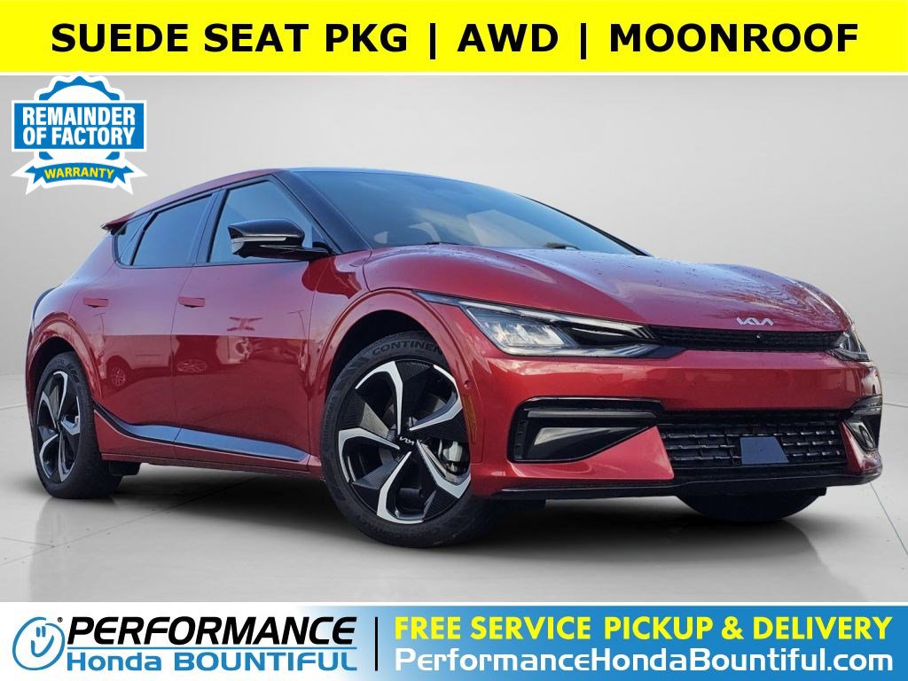This 2023 Kia EV6 GT-Line is loaded with convenient features like Suede Seat Package, Cooled Seats, Apple CarPlay, Android Auto, Heated Steering, Bluetooth, Heated Rear Seats, Moonroof, Heated Seating, Homelink, Alloy Wheels, Power Lift Gate, Heads Up Display, Multi-Zone AC. Service and Maintenance Completed: Our service department, staffed with factory-certified technicians, recently invested no less than $384 in preventative maintenance and safety equipment upgrades such as Completed a Used Car Detail, Performed 4 Wheel Alignment, and Replaced Wiper Blades, providing you with this high quality used vehicle! This stunning 2023 Kia EV6 GT-Line features a beautiful Runway Red exterior and a Black interior. This vehicle has an EPA rated fuel economy of 0.0 highway / 0.0 city. Performance Honda Bountiful proudly offer our customers at-home services including Performance Valet! When you purchase from Performance Honda Bountiful, you will be eligible for FREE Pickup & Delivery for your future service appointments! We value your time and that's why want to give you the best buying and service experiences in Bountiful! Also, ask your product specialist about our home test drives and deliveries. Save time and money through our exclusive Performance Remote Services! Distance limitations may apply. Our dealership is conveniently located off Exit 315 on I-15, North of Salt Lake City. We proudly serve the communities of Bountiful, Centerville, North Salt Lake, Farminton, Salt Lake City, Kaysville, South Salt Lake, Layton, Canyon Rim, Millcreek, West Valley City, Murray, Holladay, Taylorsville, and Syracuse. As a proud member of the family-owned Performance Automotive Network, we have access to thousands of new and used vehicles. This gives us the ability to find the perfect vehicle to fit your needs and budget.