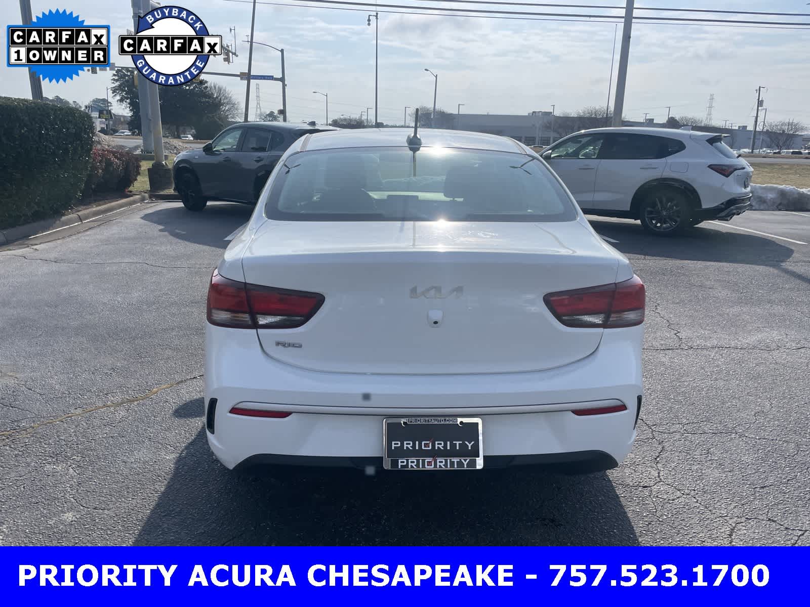 Clear White 2023 Kia Rio 4D Sedan LX 1.6L 4-Cylinder CVT FWD. CARFAX One-Owner. Priced below KBB Fair Purchase Price! 32/41 City/Highway MPG. At Priority Acura Chesapeake we believe in Market Value Pricing for all vehicles in our inventory. We use real-time Internet price comparisons to constantly adjust prices to provide all buyers the best price possible. We utilize state-of-the-art technology to constantly monitor pricing trends in order to offer our shoppers the most competitive pricing and value. We sell and service all makes and models of pre-owned / used vehicles, used cars, used trucks, used sport utility, Ford, Chevrolet/Chevy, Honda, Toyota, Porsche, Land Rover, Jaguar, INFINITI, Audi, Nissan, Mazda, Hyundai, Chrysler, Jeep, Dodge, Ram, SRT, Mitsubishi, Lexus, Kia, Volkswagen, Mini, BMW, Mercedes, Fiat, Volvo, GMC, Cadillac, Lincoln as well as other brands. Proudly serving these areas of Virginia and North Carolina: Chesapeake, Virginia Beach, Norfolk, Portsmouth, Suffolk, Smithfield, Hampton, Williamsburg, Newport News, Toano, Gorge, Lightfoot, Jamestown, Yorktown, Gloucester, Richmond, Outer Banks, Currituck, Gates, and Elizabeth City. Prices do not include tax, freight, registration fees, or dealer processing fee of $999.