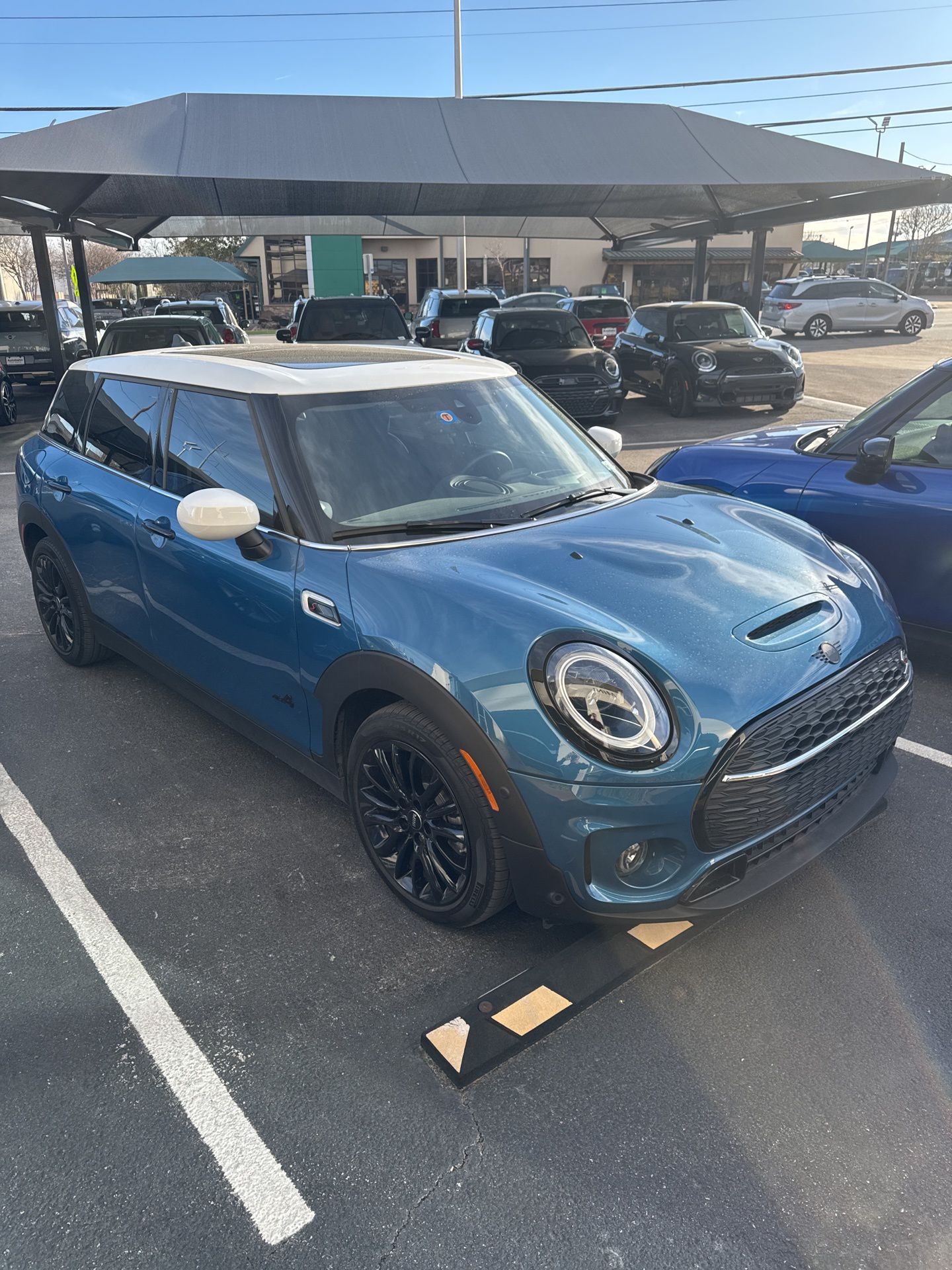 2023 MINI Cooper S Clubman Island Blue Metallic Black Interior Apple Car Play Compatible Heated Front Seats Harmon Kardon Pano Roof Power Front Seats White Roof and Mirror Caps Clean car fax