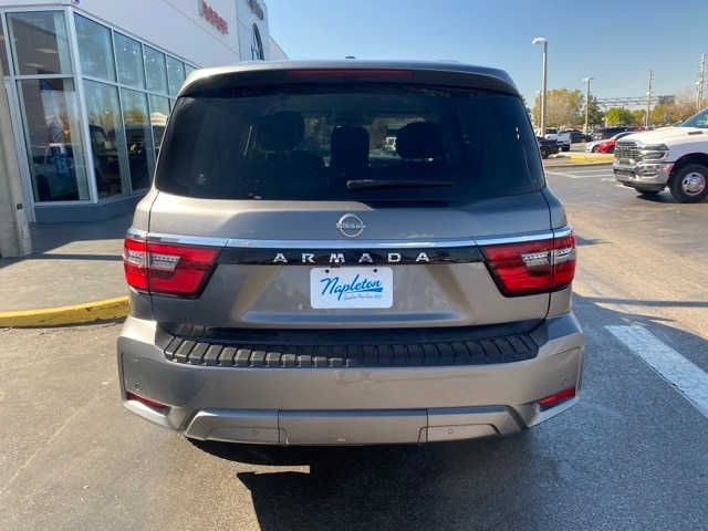 Recent Arrival! Priced below KBB Fair Purchase Price! Gun Metallic 2023 Nissan Armada 4D Sport Utility SV 5.6L V8 DOHC 32V LEV3-ULEV125 400hp RWD Clean CARFAX. This Armada is well equipped with Cargo Package, 18" x 8J Alloy Wheels, 2.94 Axle Ratio, 3rd Row Carpeted Floor Mats - Bench Seat, 3rd row seats: split-bench, 4-Wheel Disc Brakes, 6 Speakers, ABS brakes, Air Conditioning, Alloy wheels, AM/FM radio: SiriusXM, Anti-whiplash front head restraints, Auto High-beam Headlights, Auto tilt-away steering wheel, Auto-dimming Rear-View mirror, Auto-leveling suspension, Automatic temperature control, Brake assist, Bumpers: body-color, Delay-off headlights, Driver door bin, Driver vanity mirror, Dual front impact airbags, Dual front side impact airbags, Electronic Stability Control, Emergency communication system: NissanConnect Services, Four wheel independent suspension, Front anti-roll bar, Front Bucket Seats, Front Center Armrest, Front dual zone A/C, Front fog lights, Front reading lights, Fully automatic headlights, Garage door transmitter, Heated door mirrors, Heated Front Bucket Seats, Heated front seats, Illuminated entry, Knee airbag, Leather Shift Knob, Leatherette Seat Trim, Low tire pressure warning, Navigation System, NissanConnect featuring Apple CarPlay and Android Auto, Occupant sensing airbag, Outside temperature display, Overhead airbag, Overhead console, Panic alarm, Passenger door bin, Passenger vanity mirror, Power door mirrors, Power driver seat, Power passenger seat, Power steering, Power windows, Radio: NissanConnect w/SiriusXM, Rear air conditioning, Rear anti-roll bar, Rear reading lights, Rear seat center armrest, Rear window defroster, Rear window wiper, Reclining 3rd row seat, Remote keyless entry, Security system, Speed control, Speed-sensing steering, Speed-Sensitive Wipers, Split folding rear seat, Spoiler, Steering wheel mounted audio controls, Tachometer, Telescoping steering wheel, Tilt steering wheel, Traction control, Trip computer, Turn signal indicator mirrors.