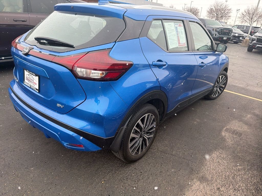 2023 Nissan Kicks SV Electric Blue Metallic 1.6L 4-Cylinder DOHC 16V FWD. Odometer is 14837 miles below market average! CARFAX One-Owner. Clean CARFAX. Come see this 2023 Nissan Kicks SV! It's the one you've been longing for! This Kicks comes equipped with these options: Apple CarPlay/Android Auto, Auto High-beam Headlights, Blind Spot Warning, Carpeted Floor Mats w/Cargo Mat, Door Pocket Light, Frameless Auto-Dimming Mirror, Fully automatic headlights, Heated door mirrors, Interior Ambient Lighting, Interior Electronics Package, Rear Parking Sensors, Splash Guards Grain (4 Piece), USB Charging Cable Set - Nissan. 31/36 City/Highway MPG. Looking for an affordable, reliable, new or used vehicle? If you've been looking at dealerships in Orland Park, Bolingbrook, or Naperville and not finding what you want, give us a try. We have a great selection of new, used, and Certified pre-owned cars and trucks on our lot, and we're sure there's one that will suit your needs. Whether it's a commuter car, family vehicle, or truck you're looking for, you'll find it here. And all of our used vehicles are inspected for quality and safety, so you can drive away with confidence.