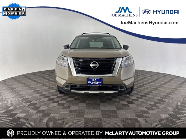 Available at Joe Machens Hyundai! Call 573-474-7400 today! 2023 Nissan Pathfinder Platinum 4WD. Baja Storm/Super Black Roof with Charcoal Interior. Clean 1 Owner CARFAX Vehicle History Report! Platinum Captain Chairs Package. Heated 2nd row captains. 2nd row removable center console. 3.5L DOHC 24-Valve 6-Cylinder Engine with 284 hp and 259 lb-ft torque. Intelligent 4x4 drive and terrain mode selector. Tow hitch with harness. At Joe Machens Hyundai, we want to offer you the best car buying experience possible! That is why we research the market to ensure that our quality pre-owned vehicles are offered to you at the market best price! No need to worry, our motto is "Find ways to say Yes!!". Shop Joe Machens Hyundai today!