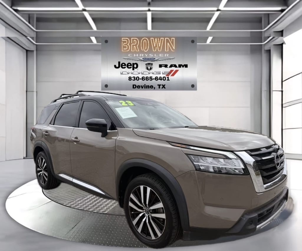 Check out this pre-owned 2023 Nissan Pathfinder we recently got in. This Nissan includes: Optional Equipment: Interior Cross Bars Full roof rack 150 lbs. maximum roof rack load Roof rails Bench Seat Carpeted Floor Mats (set of 4) Carpet front and rear floor mats Chestnut Cargo Area Protector Vinyl/rubber cargo mat Cargo net Safety First Aid Kit First aid kit Convenience Vinyl/rubber cargo mat Cargo net 150 lbs. maximum roof rack load Comfort Carpet front and rear floor mats Exterior and Appearance Pearlcoat paint Roof accent two-tone paint scheme Full roof rack Paint Baja Storm/Super Blk Roof Pearlcoat paint Roof accent two-tone paint scheme Emissions 50 State Emissions LEV3-ULEV70 emissions Tier 3 Bin 70 emissions Trailering Delete Tow Hitch Receiver and Harness Exterior Premium Paint and 2-Tone Roof - Pearl White Tricoat Additional Options Cargo Package Vinyl/rubber cargo mat Cargo net Cargo area concealed storage First aid kit Tow Delete Package *Note - For third party subscriptions or services, please contact the dealer for more information.* Treat yourself to an SUV that surrounds you with all the comfort and conveniences of a luxury sedan. Indulge yourself with one of the most highly crafted, most luxurious automobiles available today. Based on the superb condition of this vehicle, along with the options and color, this Nissan Pathfinder Platinum is sure to sell fast. Peace of mind Vehicle history report Title information Odometer readings Accident data (if applicable) Service history Vehicle usage Recall information (if applicable) Warranty status Free CarFax report A name you can trust Brown Dodge Chrysler Jeep Ram is dedicated to your satisfaction before, during, and after your purchase. We'll go the extra mile to take care of you.