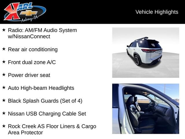 This 2023 Nissan Pathfinder Rock Creek ROCK CREEK 4WD is a versatile and well-equipped SUV that's ready to take on any adventure. Powered by a robust V6 engine and equipped with 4-wheel drive, this Pathfinder delivers impressive performance and capability. Inside, you'll find a spacious and comfortable interior with seating for up to eight passengers, as well as a wealth of advanced technology features like NissanConnect with Apple CarPlay and Android Auto. The Pathfinder's Rock Creek package adds even more style and functionality, with features like a unique black exterior trim, all-weather floor liners, and a cargo area protector. And with its impressive fuel efficiency, you can enjoy the journey without constantly stopping to refuel. Whether you're tackling the daily commute or heading out on a family road trip, this 2023 Nissan Pathfinder Rock Creek ROCK CREEK 4WD is the perfect companion. With its combination of power, capability, and premium amenities, it's sure to exceed your expectations and provide an unparalleled driving experience. This Pathfinder is also part of Karl Chevrolet's exclusive CarBravo Certified program, which means it has undergone a comprehensive 126-point inspection and comes with a 12-month/12,000-mile bumper-to-bumper limited warranty, 24/7 roadside assistance, and a vehicle history and title guarantee. You can drive with confidence knowing that this Pathfinder has been meticulously evaluated and is ready to provide you with years of reliable service. At Karl Chevrolet we want to help you find the best new or used car in Ankeny that suits your needs. When you buy a new car at Karl Chevrolet you know you're finding a vehicle you can rely on. We have a great selection of Platinum Quality Pre-Owned Vehicles. We also pride ourselves in creating a friendly atmosphere and a reliable Dealership that you can trust. Call us and our experts will be glad to help you!