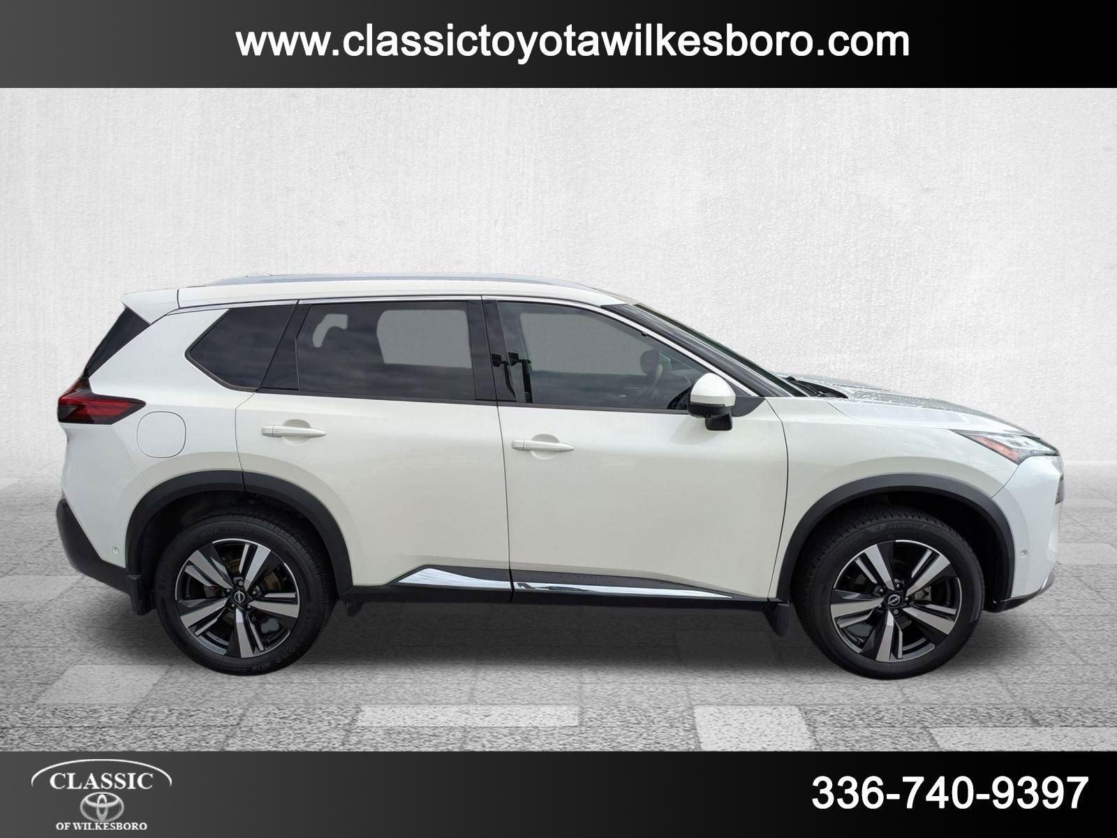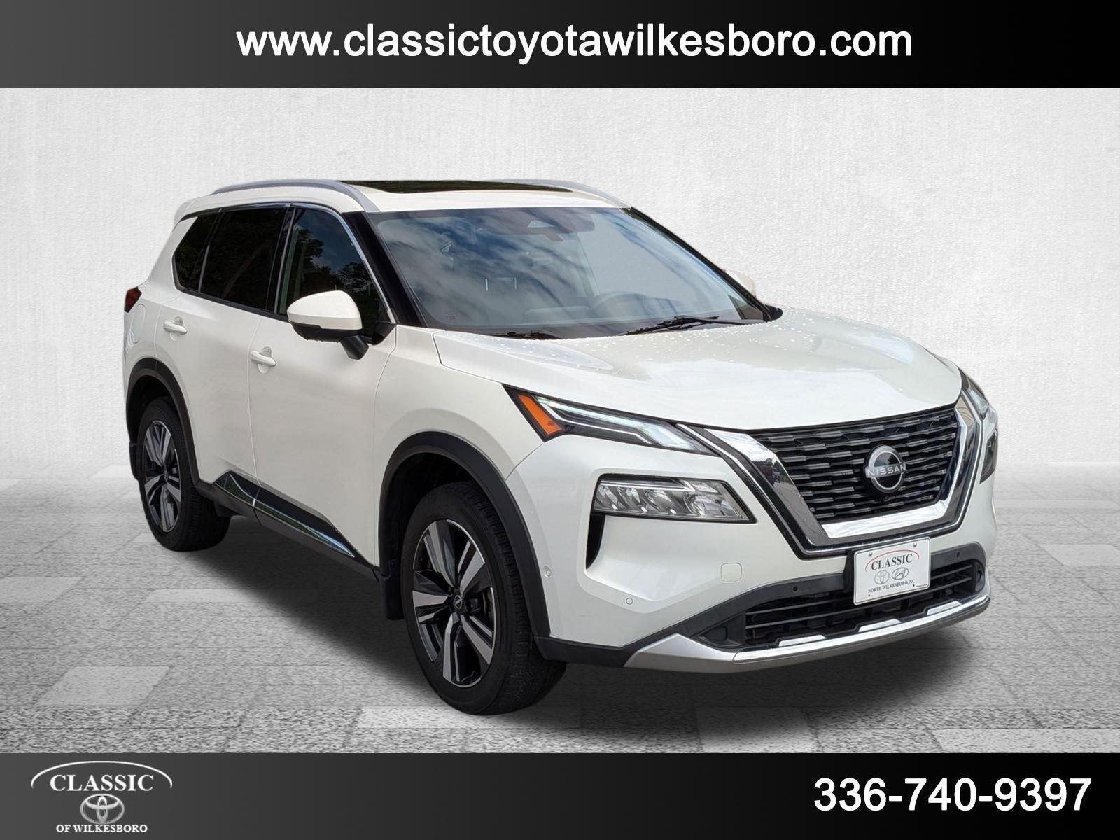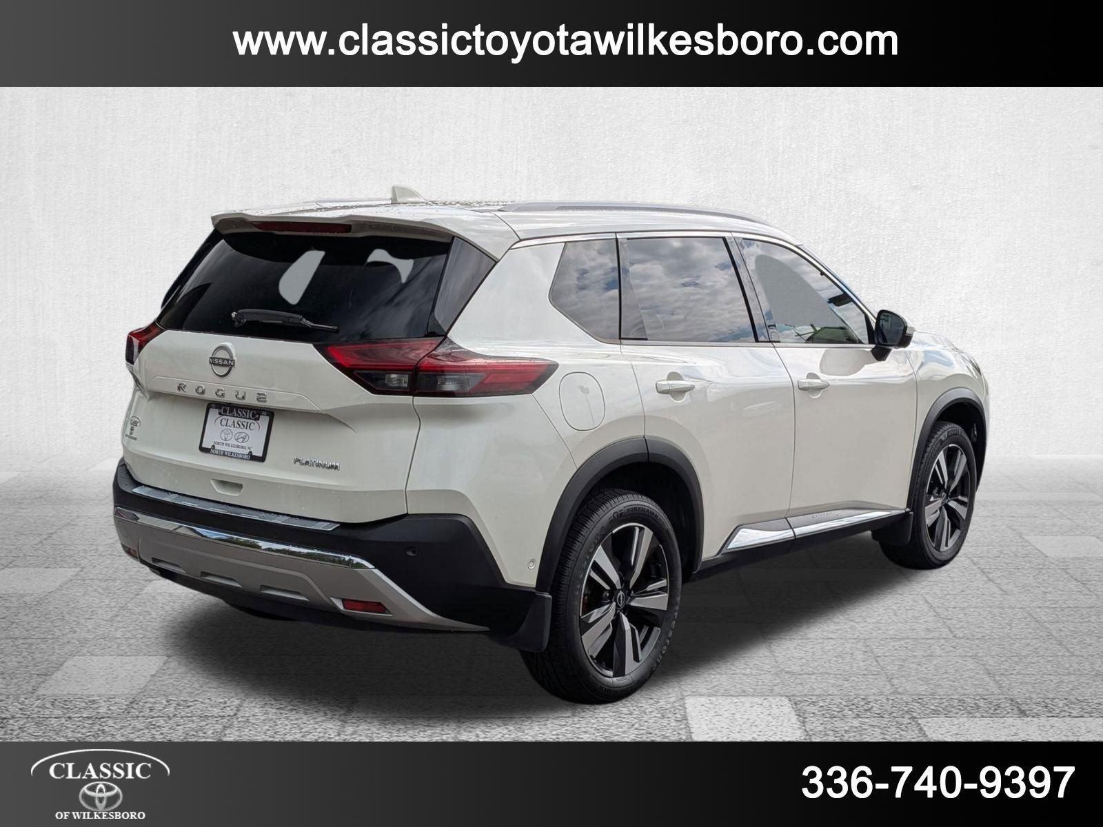 This 2023 Nissan Rogue Platinum, has a Pearl White Tricoat exterior and a Charcoal interior color. 53,370 miles. Stock Number PT4541. You can connect with us by calling 336-566-2022. This vehicle is offered by Classic Toyota of Wilkesboro and we are located at 1511 W D St North Wilkesboro NC 28659. At Classic Toyota of Wilkesboro, we're here to Serve you! Our staff is 100% dedicated to customer satisfaction and we understand that you need clear, transparent information throughout the car buying process. With our live market pricing philosophy, we offer the right cars at the right price, and the transparency to back it up! Classic Toyota of Wilkesboro is located at 1511 W D St North Wilkesboro NC 28659. Call us at 336-566-2022.