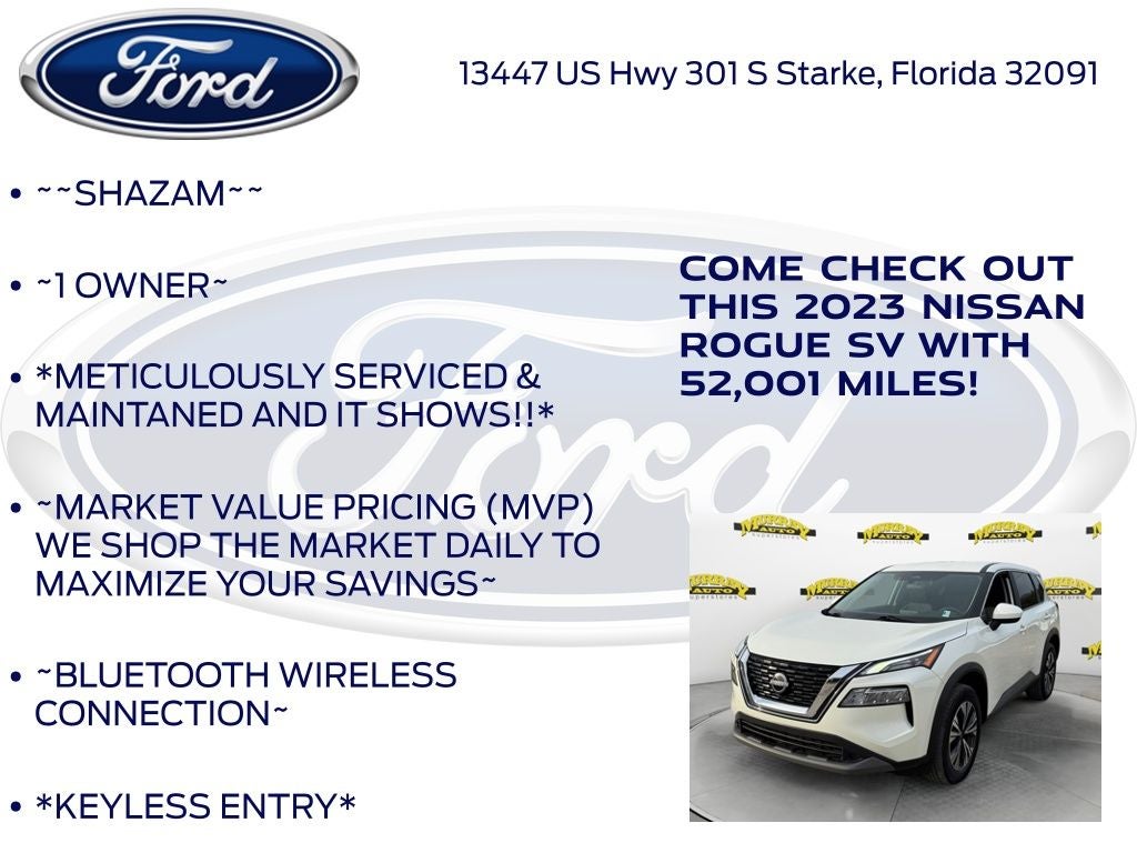 Recent Arrival! Carfax One-Owner. Priced below KBB Fair Purchase Price! Murray Ford Superstore of Starke is proud to offer this charming-looking 2023 Nissan Rogue in Pearl White. This vehicle is readily available and comes with the following AWD, 18 Aluminum Alloy Wheels, 4-Wheel Disc Brakes, 5.604 Axle Ratio, 6 Speakers, ABS brakes, Air Conditioning, Alloy wheels, AM/FM Radio, AM/FM radio: SiriusXM, Auto High-beam Headlights, Automatic temperature control, Brake assist, Bumpers: body-color, Cloth Seat Trim, Delay-off headlights, Driver door bin, Driver vanity mirror, Dual front impact airbags, Dual front side impact airbags, Electronic Stability Control, Emergency communication system: NissanConnect Services, First Aid Kit, Floor Mats w/1-Piece Cargo Area Protector, Four wheel independent suspension, Front anti-roll bar, Front Bucket Seats, Front Center Armrest, Front dual zone A/C, Front reading lights, Fully automatic headlights, Heated door mirrors, Illuminated entry, Knee airbag, Low tire pressure warning, NissanConnect featuring Apple CarPlay and Android Auto, Occupant sensing airbag, Outside temperature display, Overhead airbag, Overhead console, Panic alarm, Passenger door bin, Passenger vanity mirror, Power door mirrors, Power driver seat, Power steering, Power windows, Radio data system, Rear anti-roll bar, Rear Parking Sensors, Rear seat center armrest, Rear side impact airbag, Rear window defroster, Rear window wiper, Remote keyless entry, Speed control, Speed-Sensitive Wipers, Split folding rear seat, Spoiler, Steering wheel mounted audio controls, Tachometer, Telescoping steering wheel, Tilt steering wheel, Traction control, Trip computer, and Variably intermittent wipers. 15 Year 150,000 mile warranty at no cost applies to all vehicles excluding Transit Vans, DRW Trucks, any SVT Models, or similar vehicles. See sales for details! All vehicles will have a $999.00 dealer fee added to the total sale price (excludes A,Z,D, and X plan customers). Default to false.