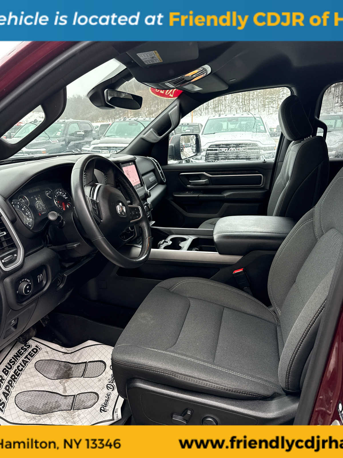 CARFAX 1-Owner. EPA 24 MPG Hwy/19 MPG City! Heated Seats, Onboard Communications System, iPod/MP3 Input, Back-Up Camera, Tow Hitch, Black, Deluxe Cloth Bucket Seats, Wheels: 20 X 9 Aluminum Chrome Clad... Remote Start System. Ram Big Horn with Delmonico Red Pearlcoat exterior and Black interior features a V6 Cylinder Engine with 305 HP at 6400 RPM.