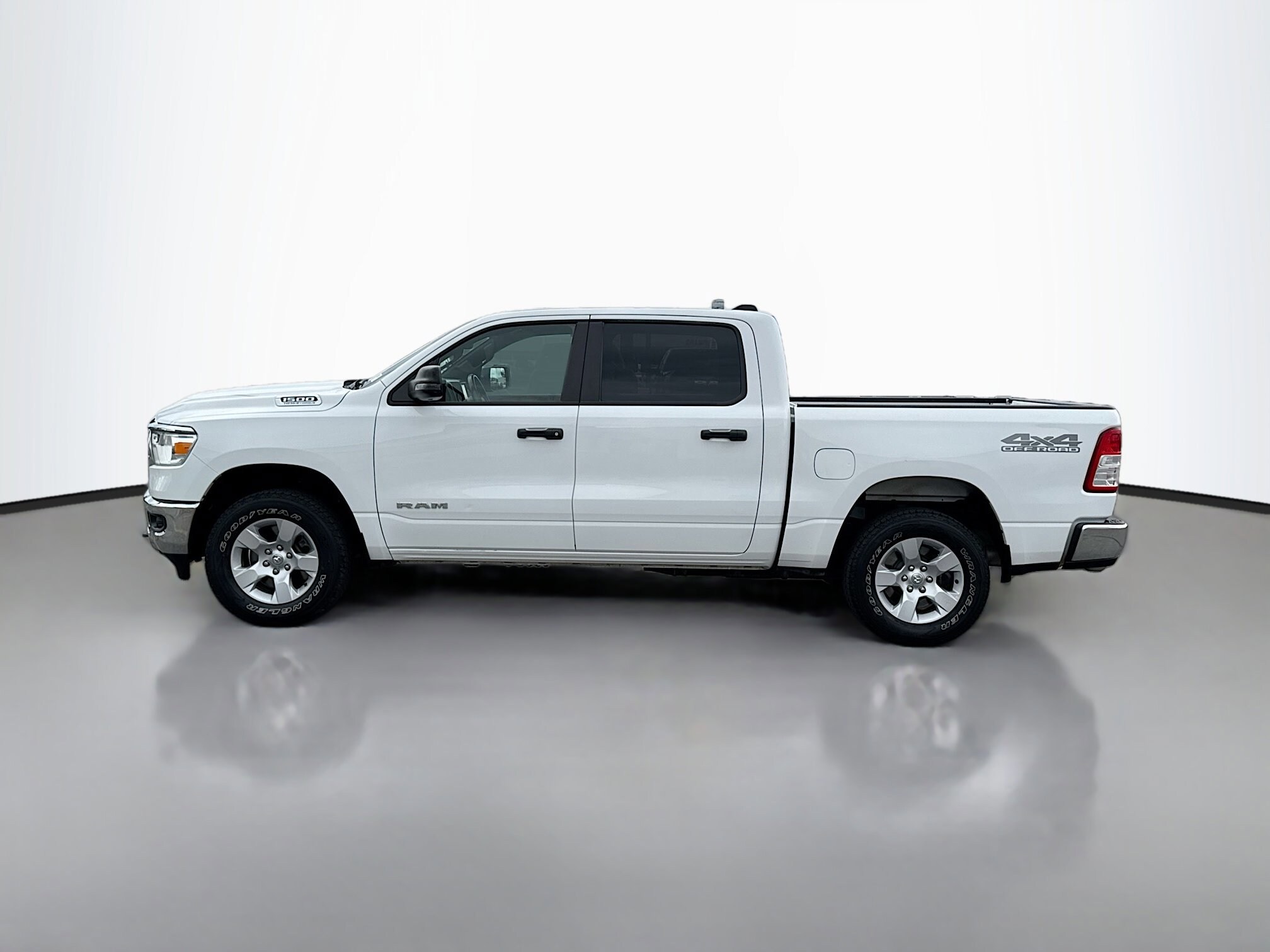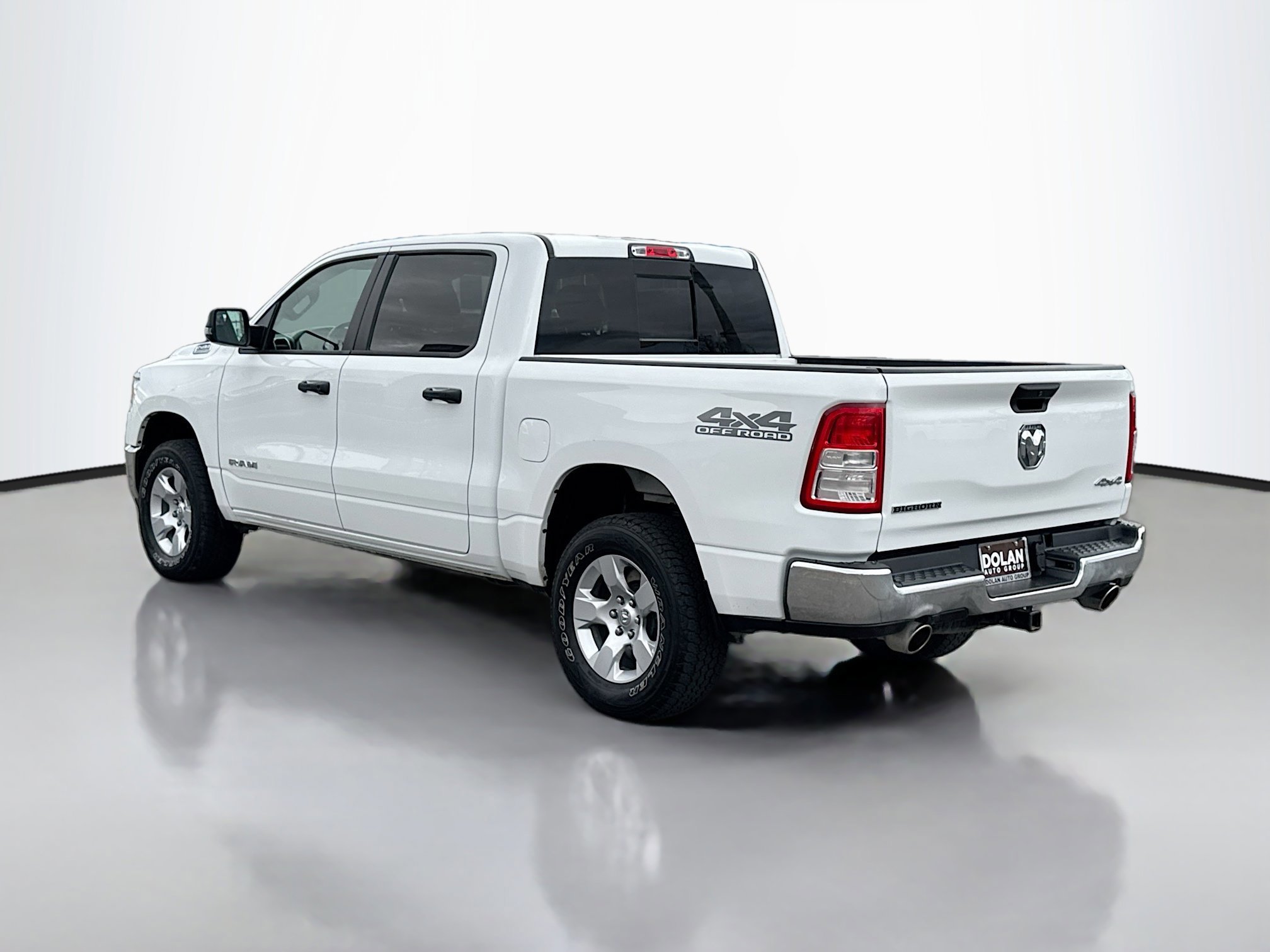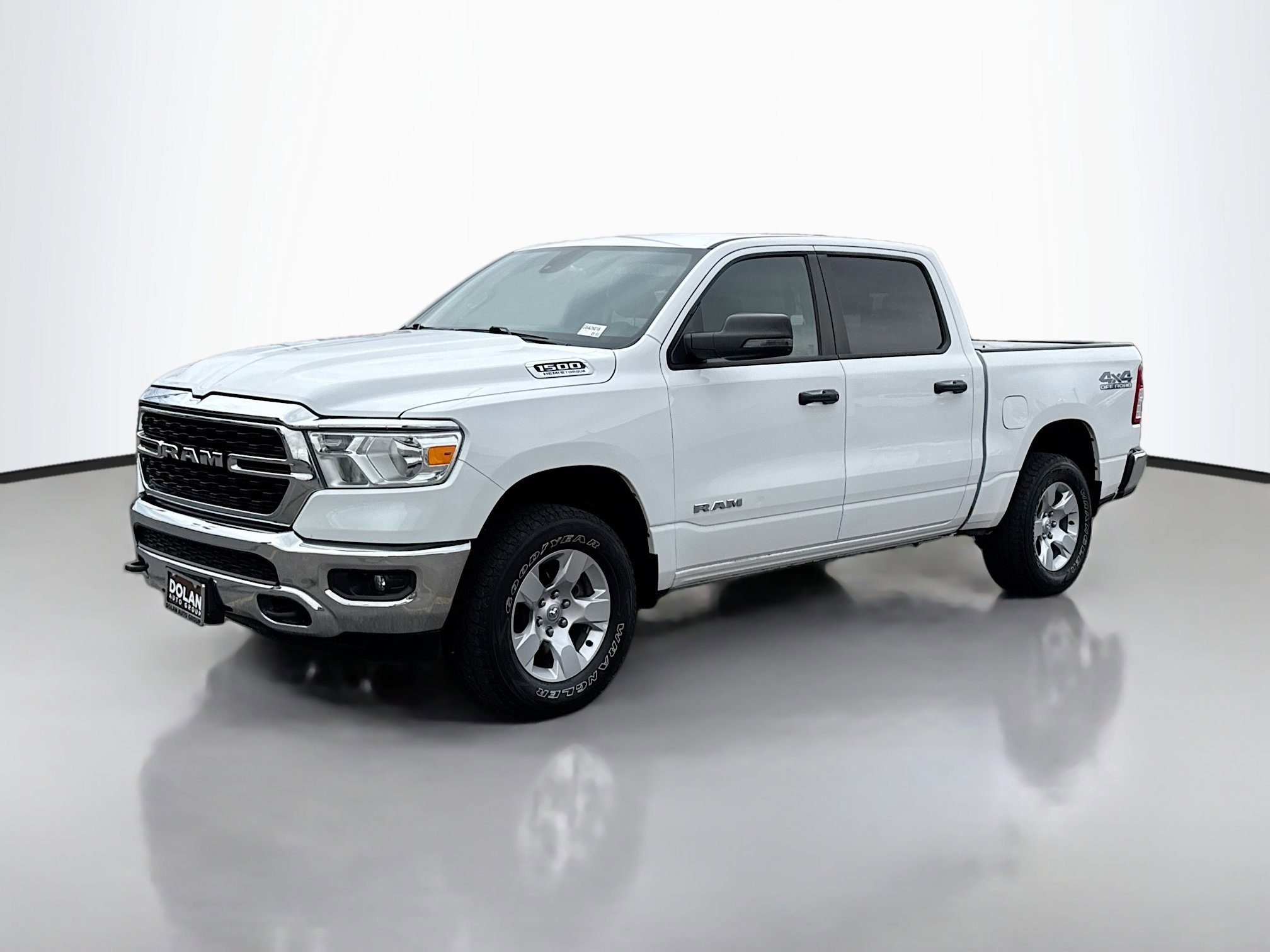The 2023 Ram 1500 Big Horn/Lone Star Crew Cab Pickup 4x4 features a V-8 engine and a mild hybrid electric powertrain. Located at Dolan Dodge Ram FIAT in Reno, NV, this vehicle offers a comfortable interior with Diesel Gray/Black seating and a range of advanced features for convenience and safety. The exterior is Bright White, complemented by alloy wheels and a variety of lighting effects for visibility and approach. This Ram is available for test drives and sale.