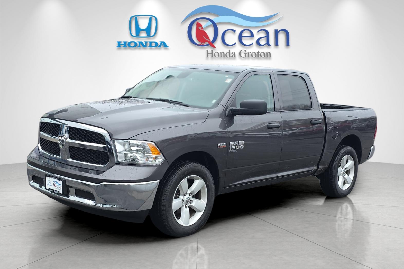 This powerful vehicle was recently acquired to our store here in Groton! This Carfax 2-Owner was previously a corporate fleet vehicle and shows a consistent service history. Originally registered in Ontario before moving to Michigan, this Ram has been maintained with a professional cadence typical of fleet-managed trucks. The Carfax displays regular intervals for oil changes and safety inspections, including a recent comprehensive service here at our facility. The Granite Crystal Metallic paint remains crisp and deep, showing the high level of care this truck received while in service. Inside, the Diesel Grey cloth seats and black interior trim are in excellent condition, showing no signs of heavy work use or staining. The 20-inch aluminum wheels are clean and wrapped in tires with significant tread remaining. This particular vehicle is equipped with the legendary 5.7L HEMI V8 and the Warlock styling package for a more aggressive street presence. It is the perfect match for a buyer needing a dependable workhorse that still looks sharp in a driveway. Vehicles with this specific HEMI powertrain and clean ownership history tend to move quickly. The RAM 1500 Classic SLT offers proven capability with usable power and practical towing and payload figures.