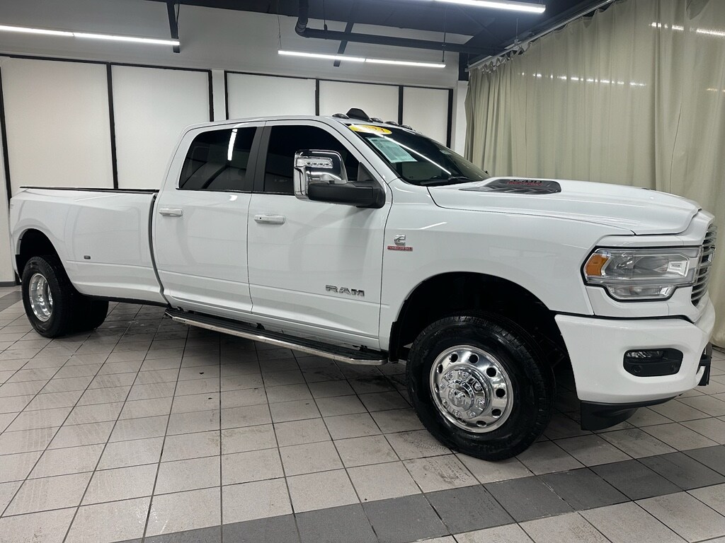 Elevate your towing and hauling capability with this powerful 2023 Ram 3500 Laramie 4WD Dual Rear Wheels, now available in Demotte, IN. Powered by the legendary 6-cylinder, 6.7L diesel engine, this heavy-duty truck delivers exceptional torque, outstanding fuel efficiency for its class, and the durability you need for demanding jobs. The Laramie trim blends rugged capability with premium comfort, featuring a Premium Sound System and Navigation to keep you connected and entertained on long hauls. Enjoy cold mornings with Remote Start and Heated Seats, while advanced safety tech like Blind Spot Monitor enhances confidence when merging or maneuvering with the dual rear wheel setup. Whether you're towing a fifth-wheel, or hauling construction equipment, this Ram 3500 is built to perform under pressure. This vehicle is priced to sell the best price for this model in the area offering exceptional value for work-ready buyers who won't compromise on comfort or capability. Meticulously maintained and ready for immediate use, it combines commercial-grade strength with upscale amenities that make every drive more enjoyable. Located in Demotte, IN, this 2023 Ram 3500 Laramie 4WD Dual Rear Wheels with the 6.7L diesel engine is a standout choice for buyers seeking maximum towing power and premium features at an unbeatable price.