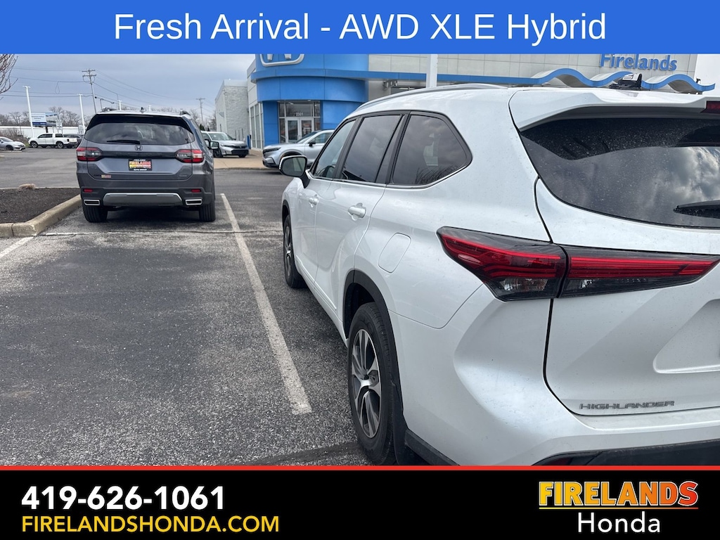 Firelands Honda is proud to offer this great-looking 2023 Toyota Highlander Hybrid in Wind Chill Pearl. This Highlander Hybrid has been checked by our award winning service department. Hot features include: Bluetooth Hands Free, Back Up Camera, Local Trade, Adaptive Cruise Control, Balance of Factory Warranty, Service Records Available, All-Wheel Drive, Heated Leather Seats, 3rd Row Seating, Locally Owned New Car Trade, Lane Departure Warning, Apple Carplay/Android Auto, Blind Spot Detection, Fog Lights, Automatic Emergency Braking, Forward Collision Warning, Rear Cross Traffic Alert, Wireless Charging Pad, Moonroof / Sunroof, Clean CARFAX, One Owner, No Accidents, 7 Passenger Seating, Power Liftgate, Captains Chairs. Odometer is 29175 miles below market average! 35/35 City/Highway MPG AWD eCVT 2.5L I4 PDI Hybrid DOHC 16V LEV3-SULEV30.