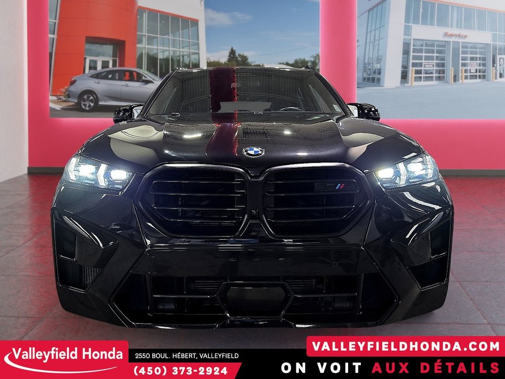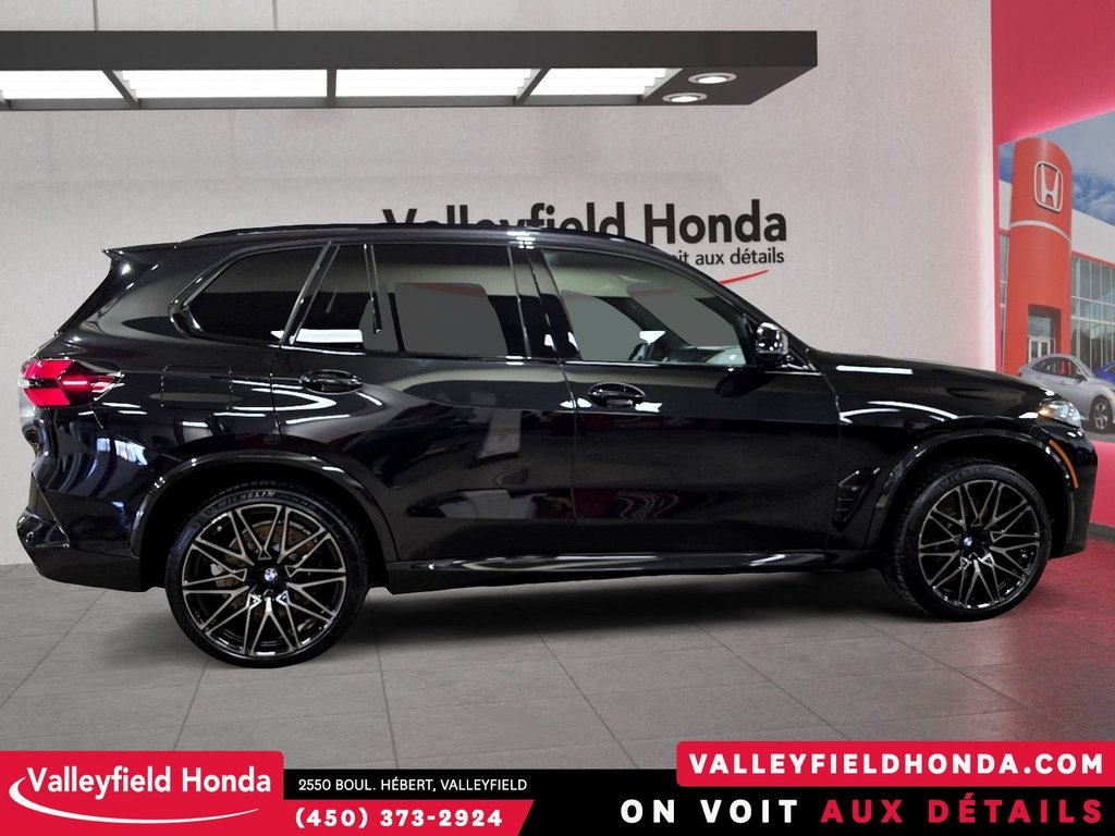 BMW X5 M Competition noir sur noir. Bas KM, inspecté, impeccable. Véhicule emblématique de vehicle, venez vivre l'expérience Valleyfield Honda. Moteur V8 4.4 L biturbo M, 617 hp. Couple 553 lb-pi. Transmission automatique 8 vitesses M Steptronic. Traction intégrale xDrive M. 0-100 km/h ~3,8 sec. Suspension adaptative M. Différentiel actif M. Freins M Compound noirs. Jantes 21"/22" étoile. Shadowline Lights. Garniture intérieure fibre de carbone. Pavillon Alcantara noir. Écran incurvé BMW avec Apple CarPlay & Android Auto. Recharge sans fil. Affichage tête haute.