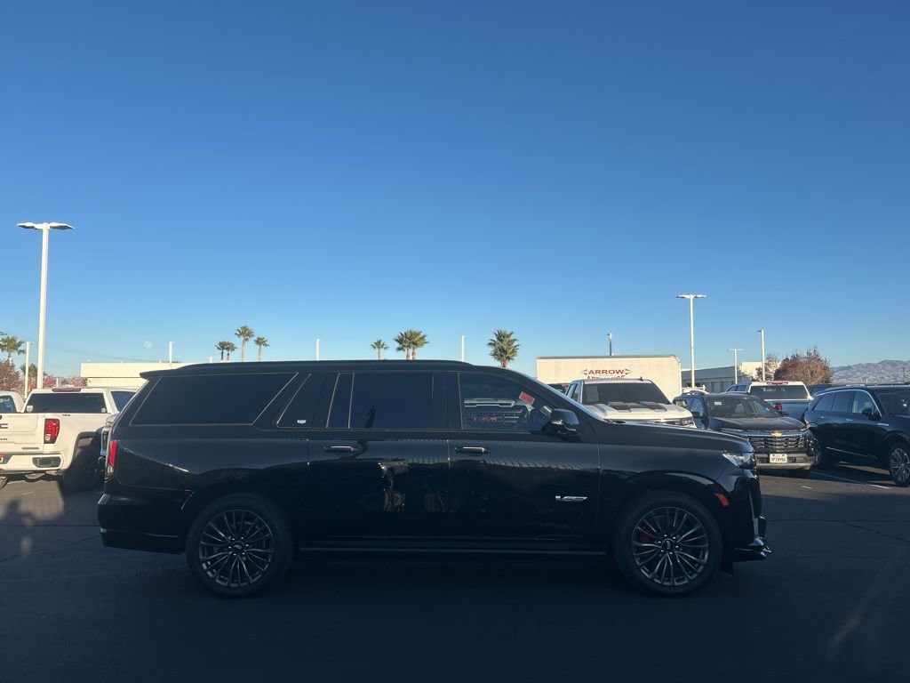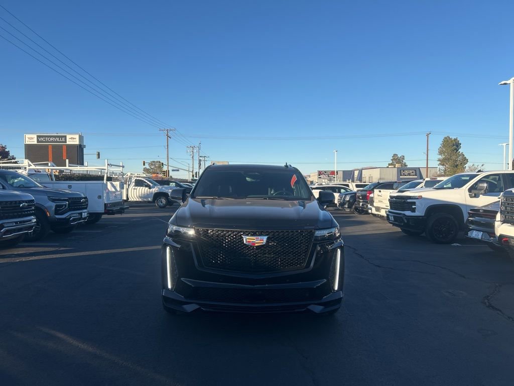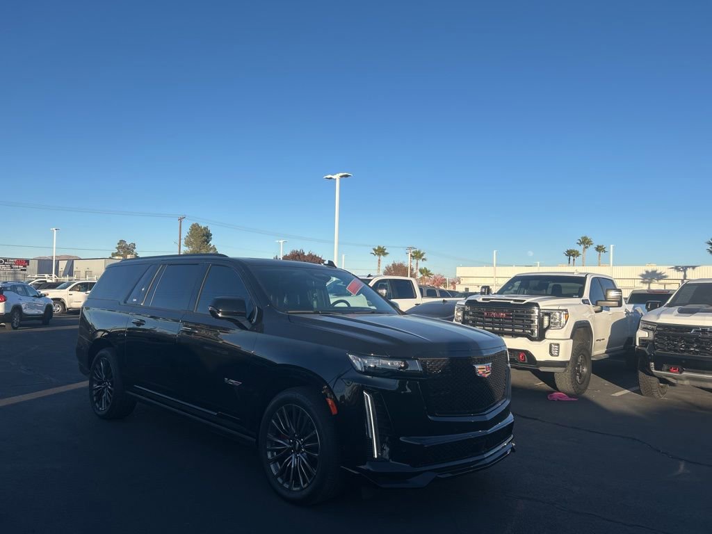 Escalade ESV V-Series, 4D Sport Utility, 6.2L V8 Supercharged, 10-Speed Automatic with Overdrive, AWD, Black Raven, Jet Black Leather. Odometer is 12894 miles below market average! CARFAX One-Owner. Clean CARFAX. Black Raven AWD 10-Speed Automatic with Overdrive 6.2L V8 Supercharged 11/16 City/Highway MPG. Buy from the dealership voted best New Car Dealership in the High Desert by readers of the Daily Press! Heavy-Duty Trailering Package (Trailer Tire Pressure Monitoring System, Trailering Assist Guidelines, and Wired Auxiliary Trailer Camera), Preferred Equipment Group 1SD (Active Noise Cancellation, Adaptive Cruise Control, AKG Studio Reference 36-Speaker Audio System, Automatic Seat Belt Tightening, Body-Color Door Handles, Door Lock & Latch Shields, Electronic Limited-Slip Differential, Enhanced Automatic Emergency Braking, Enhanced Automatic Parking Assist, Floor Console w/Covered Storage, Front Auxiliary 12-volt Power Outlet, Glass Breakage Sensor, Heated & Ventilated Driver & Front Passenger Seats, Hitch Guidance w/Hitch View, Integrated Trailer Brake Controller, Platinum Interior Trim, Power Lumbar Massage Driver Seat, Power Lumbar Massage Front Passenger Seat, Power Panoramic Tilt-Sliding Sunroof, Power-Retractable Assist Steps, Rear Camera Mirror, Rear Camera Mirror Washer, Rear Cross Traffic Alert, Rear Seat Entertainment System, Reconfigurable Full-Color Head-Up Display, Reverse Automatic Braking, Smart Trailer Integration Indicator, Theft-Deterrent Alarm System, Trailer Side Blind Zone Alert, Vehicle Inclination Sensor, and Vehicle Interior Movement Sensor), Touring Package (Air Ride Adaptive Suspension, Illuminating Front & Rear Sill Plates, and Soft Closing Front & Rear Doors).