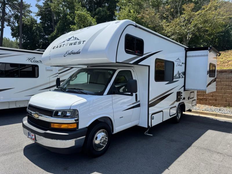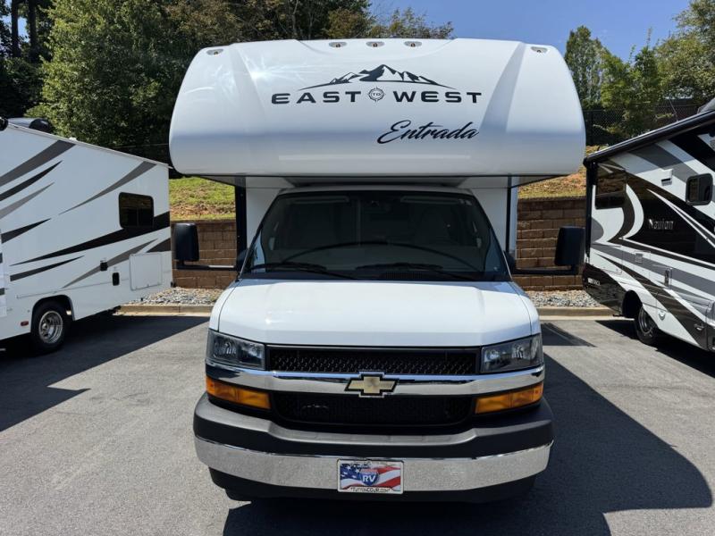 EAST TO WEST Entrada Chevy Class C gas motorhome 220SC highlights: The journey will be enjoyable when you use this Entrada Class C gas motorhome to explore! You will be able to create meals each day that you are on the road because the kitchen has everything you will need, like a convection microwave, a round sink, a cooktop, a flip-up countertop, and a 10.7-cubic foot refrigerator. There is even a pantry/wardrobe for you to use to store spices, chips, or canned goods. Across from the queen bed slide, you'll find a private bath so you can get cleaned up in the morning, and the vanity with a medicine cabinet is located just outside the bathroom so that someone can brush their teeth while another is showering. With any Entrada Class C gas motorhome from EAST TO WEST, the construction consists of a completely laminated coach, a one-piece molded fiberglass front cap, 2" thick sidewalls with Azdel composite exterior, a Dicor Diflex II TPO roof, and integrated entry step. Some of the Entrada value package features include 12V tank heaters to camp during the cooler months, the Winegard Air 360+, plus backup and sideview cameras with monitor for safety on and off the road. The interior offers a 7-foot interior height for a spacious feel, and hardwood shaker style cabinets. Choose an Entrada for its tasteful design, attention to detail, bright interior and/or affordable price-point!