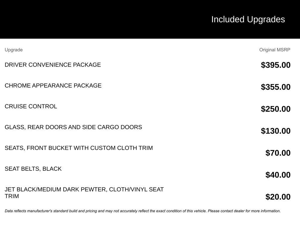 Sale prices include convenient and competitive financing through our lenders. This 2024 Chevrolet Express 2500 Work Van Cargo is a reliable and versatile choice for your business needs. With its one-owner history and no accident record, you can trust this van to deliver consistent performance and long-lasting value. Equipped with a powerful 4.3L V6 engine and an 8-speed automatic transmission, this Express 2500 Work Van Cargo delivers the performance and capability you need to get the job done. The chrome appearance package and driver convenience features add a touch of style and comfort to your daily driving experience. The spacious cargo area, with its rear and side cargo door glass, provides ample room to transport your tools, equipment, or supplies. The front bucket seats with custom cloth trim and inboard armrests offer a comfortable and supportive ride, while the cruise control and tilt steering wheel add to the overall driving ease. Backed by Chevrolet's reputation for reliability and durability, this 2024 Express 2500 Work Van Cargo is an excellent choice for your business. Whether you're hauling materials, transporting a crew, or simply need a versatile work van, this vehicle is ready to take on the task. At our dealership, we're committed to providing our customers with exceptional vehicles and unparalleled service. We understand the importance of finding the right work van to support your business, and we're here to help you every step of the way. Take a closer look at this 2024 Chevrolet Express 2500 Work Van Cargo and experience the quality and capability it has to offer. Schedule a test drive today and let us show you how this van can make a difference in your daily operations.