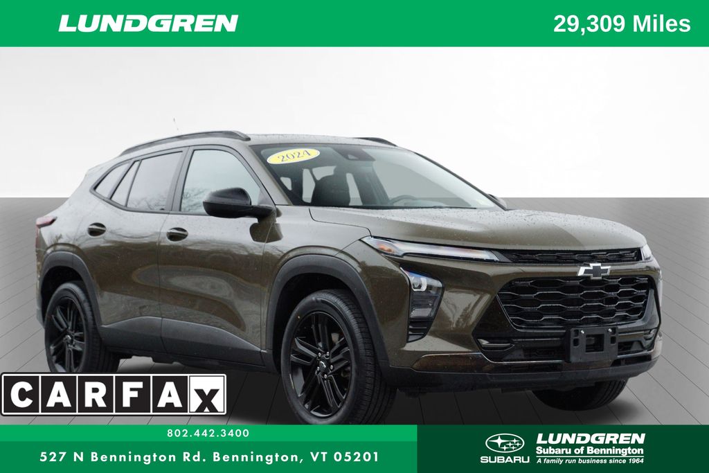 This 2024 Chevrolet Trax Activ is a sharp, modern crossover with a really nice look and feel to it. We outfitted it with 4 brand new tires and went through a full safety inspection here at Lundgren, so it's been properly checked over and ready to go. It's comfortable, easy to drive, and has the updated tech and styling that make it stand out from the typical small SUV. It also comes with our Lundgren Cars exclusive 6 month/6,000 mile powertrain warranty! 2024 Chevrolet Trax Activ CARFAX One-Owner. 2024 Trax Chevrolet Activ FWD 28/32 City/Highway MPG 6-Speed Automatic. Lundgren Subaru is dedicated to your satisfaction before, during, and after your purchase. We'll go the extra mile to take care of you.