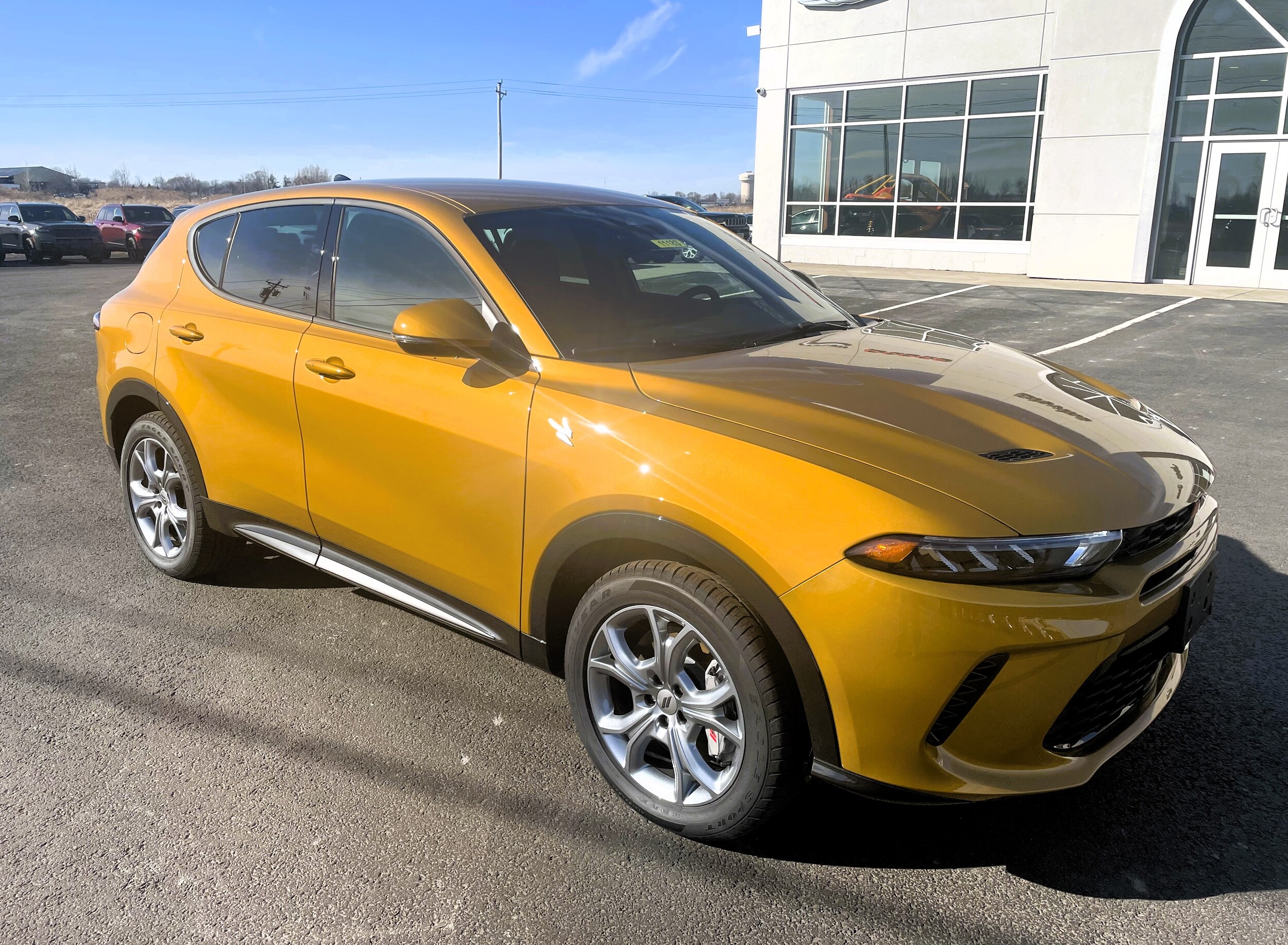 Acapulco Gold 2024 Dodge Hornet R/T AWD 6-Speed Automatic 1.3L I4 Vehicle is equipped with: Quick Order Package 28B (DISC), 10.25" Touchscreen Display, 4-Wheel Disc Brakes, 6 Speakers, ABS brakes, Air Conditioning, Alloy wheels, AM/FM radio: SiriusXM, Anti-whiplash front head restraints, Apple CarPlay, Apple CarPlay/Android Auto, Auto High-beam Headlights, Auto-dimming Rear-View mirror, Brake assist, Bumpers: body-color, Cloth/Leatherette Seats, Compass, Connectivity - US/Canada, Delay-off headlights, Disassociated Touchscreen Display, Driver door bin, Driver Seat Memory, Driver vanity mirror, Dual front impact airbags, Dual front side impact airbags, Electronic Stability Control, Emergency communication system: Dodge Connect, Four wheel independent suspension, Front Bucket Seats, Front Center Armrest w/Storage, Front dual zone A/C, Front reading lights, Fully automatic headlights, Garage door transmitter, Google Android Auto, GPS Antenna Input, Heated door mirrors, Heated front seats, Heated steering wheel, Illuminated entry, Knee airbag, Lane Departure Warning System, Leather Shift Knob, Leather steering wheel, Low tire pressure warning, Manufacturer's Statement of Origin, Memory seat, Normal Duty Suspension, Occupant sensing airbag, Outside temperature display, Overhead airbag, Overhead console, Panic alarm, ParkView Rear Back-Up Camera, Passenger door bin, Passenger vanity mirror, Power 4-Way Driver Lumbar Adjust, Power Adjust 8-Way Driver Seat, Power door mirrors, Power driver seat, Power steering, Power windows, Radio: Uconnect 5 w/10.25" Display, Rain sensing wipers, Rear anti-roll bar, Rear seat center armrest, Rear window defroster, Rear window wiper, Remote keyless entry, Security system, Speed control, Speed-sensing steering, Split folding rear seat, Spoiler, Tachometer, TBD Axle Ratio, Telescoping steering wheel, Tilt steering wheel, Traction control, Trip computer, Turn signal indicator mirrors, Variably intermittent wipers, and Wheels: 18" x 7.5" Graphite Aluminum. Blevins Bros is here to assist with your buying needs, this means an amiable, pressure-free environment. Rather than push cars, Blevins Bros. Suggests the ones that will best meet your lifestyle and budget...For people who might not have the best memory and/or diligence when it comes to getting their new Dodge, Jeep, Chrysler and RAM or used car serviced, we help make sure you stay on track so you can get every last mile paid for. Blevins Bros. Even has drivers' backs covered in the event of an accident, thanks to our state-of-the-art Dodge, Jeep, Chrysler and RAM collision center and expert staff who are continuously training on the latest repairs and tools of the trade.