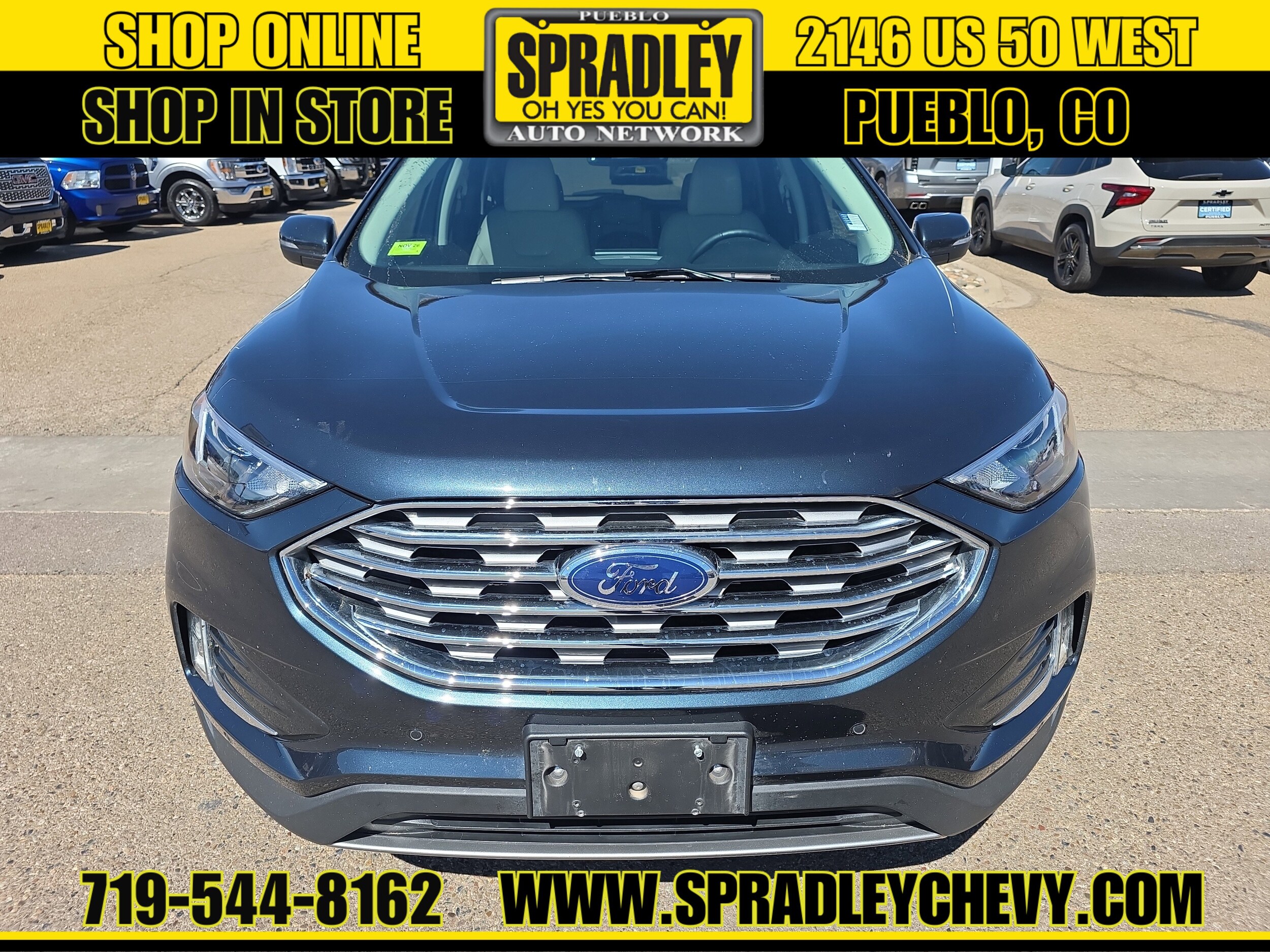 CARFAX One-Owner. Stone Blue Metallic 2024 Ford Edge Titanium AWD 8-Speed Automatic EcoBoost 2.0L I4 GTDi DOHC Turbocharged VCT AWD. Recent Arrival! Odometer is 29129 miles below market average! 21/28 City/Highway MPG Come in and see why people buy from Spradley Chevrolet Hyundai and then send their friends and family. We pride ourselves on being the best in customer service and giving you the best deal possible. And if you have good credit, bad credit, bankruptcy, or are a first time buyer, we can help! Call Spradley Chevrolet Hyundai’s Internet Department today at 719-544-8162 and schedule your time to come in and test drive any of our new Chevrolet Silverado 1500, Impala and Suburban’s or Hyundai Santa Fe, Tucson and Accent’s. And don’t forget, we have all makes and models of pre-owned to choose from. Located at 2146 HWY 50 West, Pueblo, Colorado, where you will always hear, “Oh Yes You Can!” Spradley Chevrolet Hyundai, your dealership for all of Southwest, Southeast and Southern, Colorado!