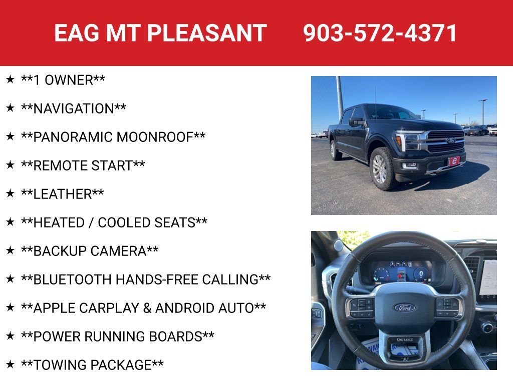 Recent Arrival! Agate Black Metallic 2024 Ford F-150 King Ranch 4WD 10-Speed Automatic 3.5L V6 EcoBoost. This vehicle is located at EAG Mt. Pleasant but can be made available upon request. The price listed does not include tax, title, license, or documentation fees ($225). We are located just west of Titus Regional Medical Center on the I-30 frontage road.