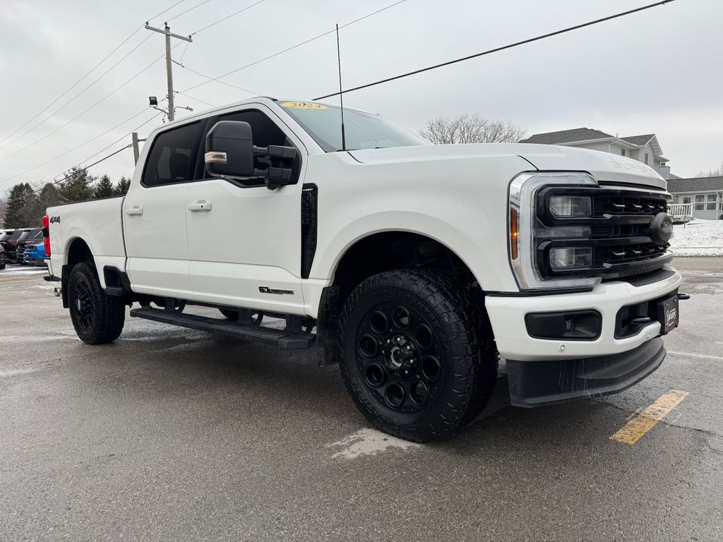 LOCAL TRADE. Clean history. This is a 2024 Ford F-250 Lariat 4x4 Crew Cab with the 6.7L Power Stroke V8 Diesel. The kind of truck you buy and keep a long while. It has the Lariat Ultimate Package, Black Appearance Package, and the 5th Wheel Hitch Prep Package already in place. Saves you the trouble later. The Twin Panel Moonroof brings in some sky going past the fields outside West Branch, and Pro Power Onboard - 2kW is there when you need to run tools or tailgate gear without dragging a generator along. It sits on 20" High Gloss Black Aluminum Wheels and has the Tough Bed Spray-In Bedliner ready for real work. If you've been thinking about stepping into a serious diesel, come see it.