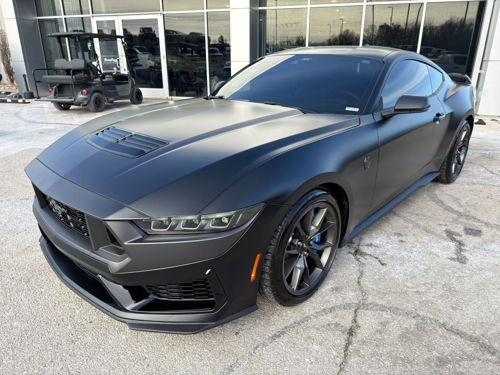Matte clear wrapped 2024 Ford Mustang Dark Horse coupe track-bred V8 thrill! Shadow Black, 5.0L 4V DOHC V8, 10 speed auto, equipment group 700A, heated/cooled front power seats, heated steering wheel, tech pack, 3.55 Torsen rear axle, Magneride damping system, active valve performance exhaust, Brembo brakes, premium 19in wheels. Premium B&O audio (12 speakers), SYNC with wireless Apple CarPlay/Android Auto, push button start, remote start, Ford Co-Pilot360, wireless charging pad, security package, matte clear film, plus gas guzzler tax; original MSRP $74,010.00. We ship nationwide. Part of Ford's Reacquired Vehicle Brand program and comes with a 12 month 12,000 mile special Ford Motor Company factory limited bumper to bumper warranty. Starts from date of your purchase (may overlap existing factory warranty, excludes normal wear and tear items).