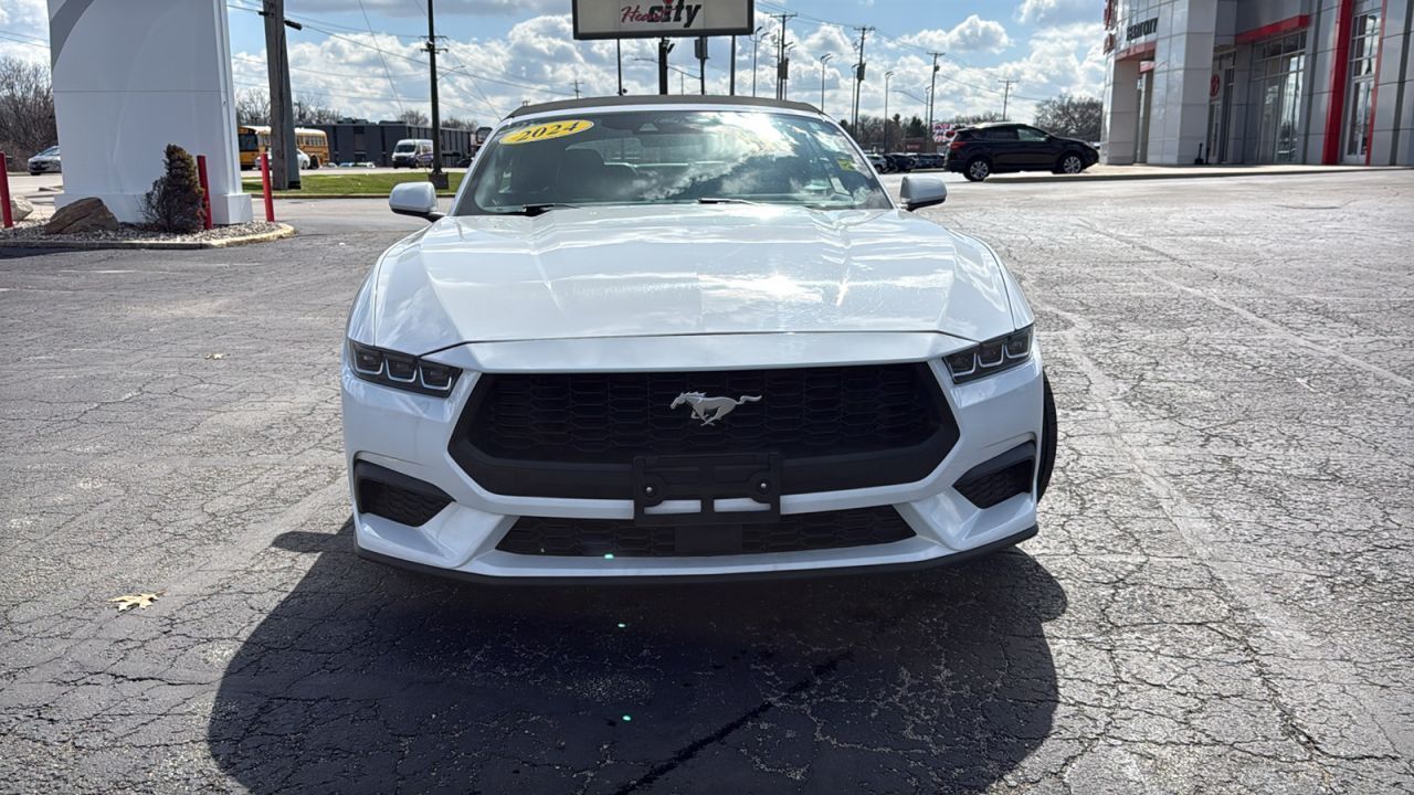 Heart City Toyota has this used 2024 Ford Mustang EcoBoost Premium Convertible car for sale near Mishawaka with the following. This used rwd Ford Mustang for sale near Goshen features a White Exterior with a Black Onyx Interior. This 2024 Ford Mustang comes factory equipped with an impressive EcoBoost 2.3L I4 GTDI DOHC turbocharged VCT engine, and a 10-speed automatic transmission. Other installed mechanical features include power one-touch down windows, traction control, power mirrors, cruise control, ventilated disc brakes, intermittent wipers, tachometer, trip computer, variable speed intermittent wipers, and power steering. This 2024 Ford Mustang for sale in Elkhart County includes automatic climate control, heated front seats, compass, power driver's seat, bucket front seats, telescoping wheel, steering wheel audio controls, air conditioning, illuminated entry, center console storage, multi-zone climate control, rear window defroster, center armrest, AM/FM stereo, outside temperature gauge, trip odometer, tilt steering wheel, reading lights, vanity mirrors, and overhead console. Come check out this Ford Mustang for sale which has color matched bumpers, power retractable roof, alloy wheels, and auto high-beams. Your 2024 Ford Mustang has rear parking aid, electronic stability control, rain sensing wipers, backup sensors, back-up camera, emergency SOS system, security system, brake assist, Aftermarket anti theft system, auto highbeams, ABS brakes, knee airbag, dual air bags, delay-off headlights, front head restraints, speed sensitive power steering, tire pressure monitoring system, low tire pressure warning, driver front side impact air bag, passenger air bag sensor. Heart City Toyota proudly serves Elkhart, IN and the surrounding communities of South Bend, Mishawaka & Goshen. You can also visit us at 711 North Nappanee Street, Elkhart, IN to check it out in person!