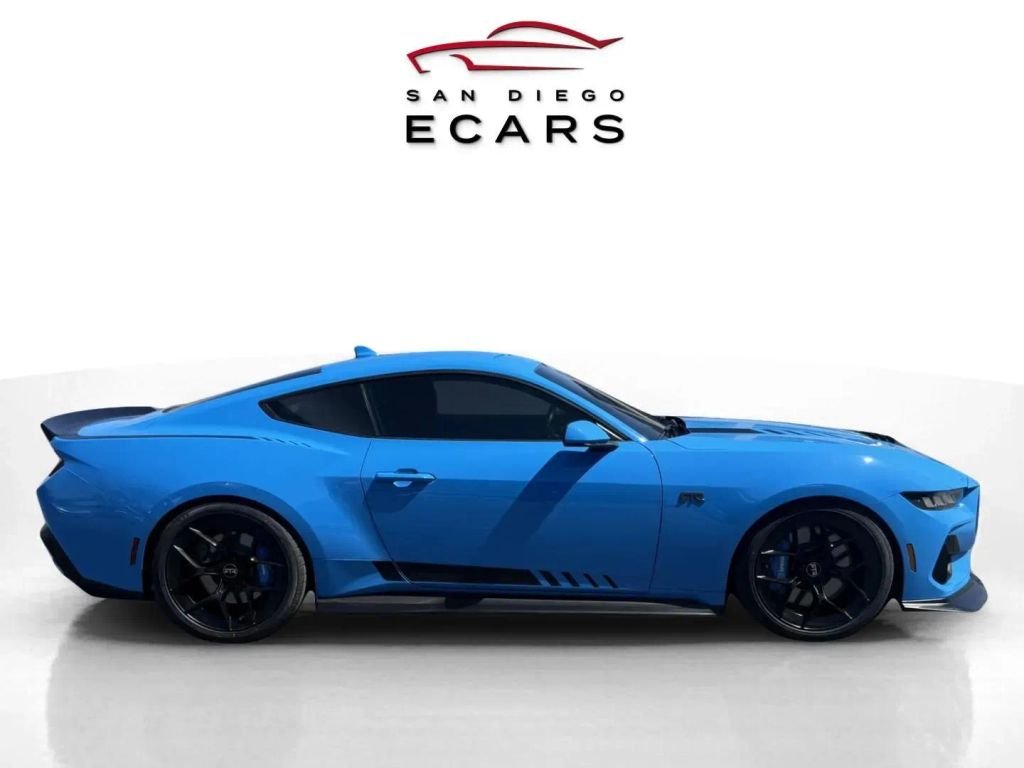 This Grabber Blue Metallic Mustang GT delivers the thrill of modern muscle enhanced by the RTR Spec package for commanding street and track presence. Powered by a 480HP 5.0L Ti-VCT V8 and paired with a quick-shifting automatic transmission it puts raw performance and instant response right at your fingertips. The RTR package adds aggressive styling and performance upgrades including the signature RTR grille with LED lighting, performance rear wing, unique chassis tuning, heavy-duty springs, upsized sway bars, Brembo brakes with Grabber Blue calipers and an electronic drift brake for precise control. Aerodynamic RTR design elements further sharpen its stance while enhancing capability. Inside the driver-focused cabin features heated bucket seats, SYNC 4 with an expansive 13.2' touchscreen, MyColor ambient lighting and seamless Apple CarPlay and Android Auto connectivity. Safety features include BLIS (Blind Spot Information System) Lane Keeping Assist and Pre-Collision Assist. Inspired by Vaughn Gittin Jr. this RTR Mustang GT is more than just a muscle car—it's a bold performance machine built to be seen, heard and driven hard.