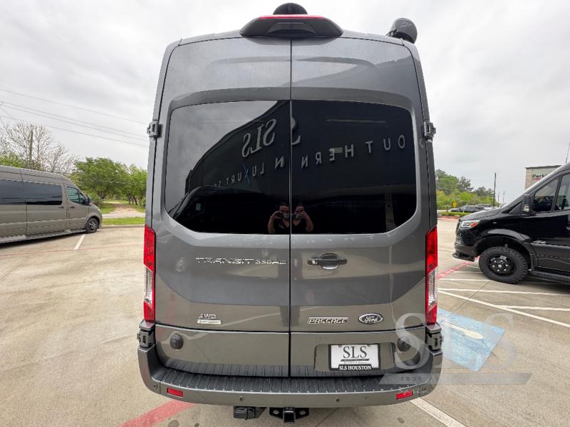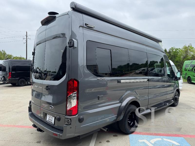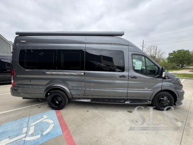 Midwest Automotive Designs Passage Class B gasoline motorhome MD2 Lounge highlights: Rear Lounge Bed, Removable Table, Pantry, Wardrobe, Wet Bath. This Passage Class B gasoline motorhome will have you daydreaming about your next trip with your spouse. Just imagine relaxing on the rear power lounge with your feet up. You might have decided to leave the removable table in the back location to eat a snack made in the galley. Your spouse might be stretching his legs after he turned the swivel captain's chair towards you. There is a wet bath to keep you refreshed and ready for the next day, and the power lounge becomes a sleeping space for two if you decided to skip the hotel stay this trip. You also have the ability to add an optional power drop-down loft bed to this model so that you can have even more comfort and convenience. This model is also built on an extended chassis! Each Passage Class B gasoline motorhome begins with the safety and performance engineering of the Ford Transit and includes luxury and convenience throughout. The Suburban water heater offers instant hot water on demand, the convection microwave and induction cooktop allow you to make meals whenever you like, and the 12 Volt/110 Volt refrigerator allows you to store cold items while traveling. The style and comfort of the hand-stitched leather seating, polished wood veneer cabinets, and solid surface countertops will impress you every time you take to the road. You also have the convenience of technology with a 100-Watt rooftop solar charging system, an HDMI input, and a location prepped for satellite TV and Wi-Fi!