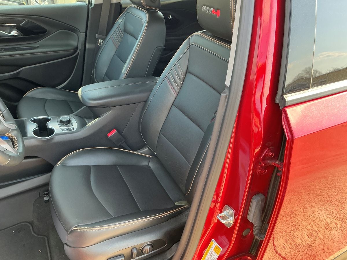 The 2024 GMC Terrain AT4 offers a connected, smooth ride with a 1.5L Turbo 4-cylinder engine and all-wheel drive capability. The interior features perforated leather-appointed seat trim with an AT4 logo, while the exterior is Volcanic Red Tintcoat. This vehicle is equipped with advanced safety features and comfort amenities, providing a comfortable and secure driving experience.