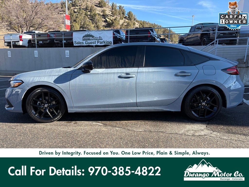 Introducing the 2024 Honda Civic Hatchback Sport, available at Durango Motor Company. Finished in the sleek Sonic Gray Pearl with a Black interior, this hatchback delivers sporty styling, everyday practicality, and impressive efficiency. Powered by a responsive 2.0L 4-cylinder engine paired with a smooth CVT, the Civic Sport offers a refined driving experience with excellent fuel economy, rated at 29 MPG city and 37 MPG highway. Its versatile hatchback design provides added cargo flexibility, while features like Honda Sensing safety technology, adaptive cruise control, Apple CarPlay and Android Auto, and 18-inch alloy wheels enhance both comfort and confidence behind the wheel. Designed for commuters and drivers who want fun without sacrificing practicality, this Civic strikes a perfect balance of style and efficiency. At Durango Motor Company in Durango, Colorado, our non-commissioned sales team is here to help you find the right vehicle at the right price. If youd like more details, additional photos, or a personalized walk-around video, our team is happy to assist. Durango Lincoln is dedicated to your satisfaction before, during, and after your purchase. We'll go the extra mile to take care of you.