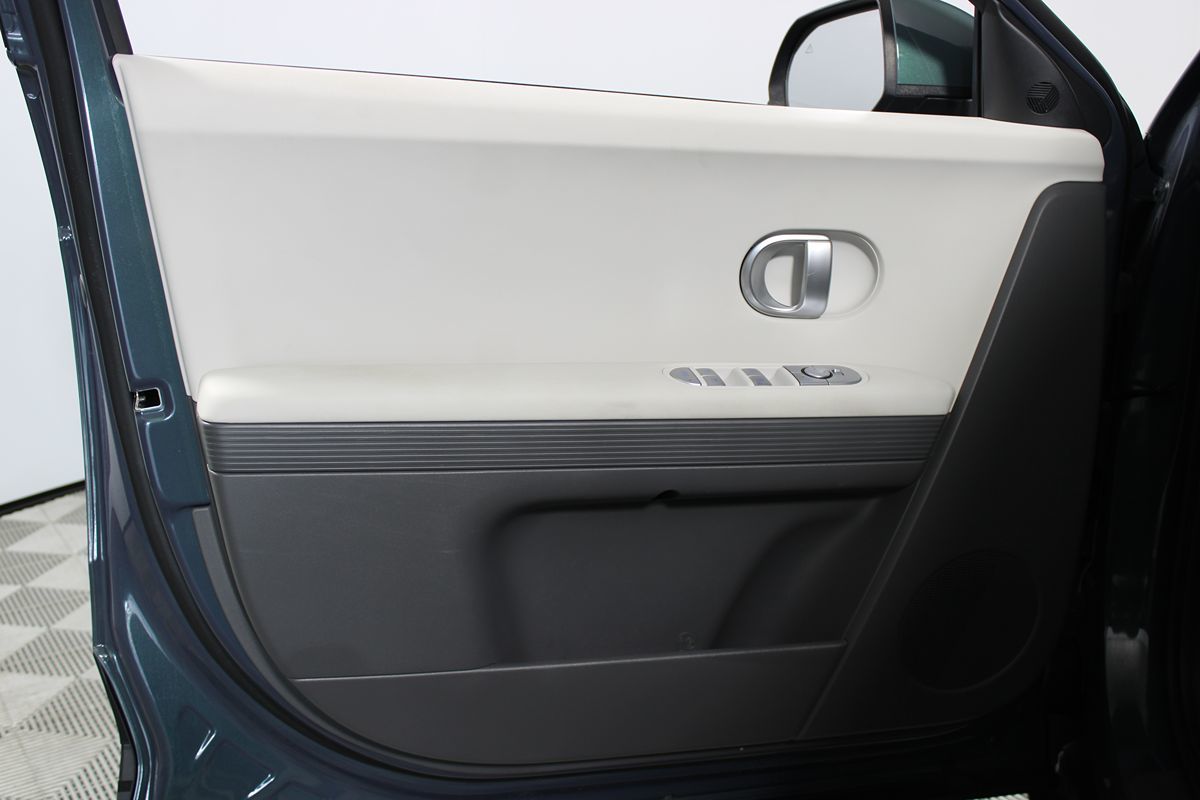 The 2024 Hyundai IONIQ 5 SE RWD in Digital Teal radiates a futuristic yet sophisticated presence, epitomizing modern automotive design. Its striking exterior is accentuated by sleek LED headlights and carefully sculpted contours that not only enhance its aesthetic appeal but also contribute to its aerodynamic efficiency. Complementing this vivid exterior is the refined Gray interior, offering a serene environment that seamlessly merges comfort with cutting-edge technology. This electric marvel is equipped with a host of advanced features designed to elevate the driving experience. Active cruise control and forward collision warning ensure peace of mind on long journeys, while the blind spot monitor and lane departure warning aid in maintaining safety in busy traffic. The inclusion of lane keep assist further bolsters the vehicle's safety capabilities, allowing for a smoother, more controlled ride, even on winding roads. Heated seats add a layer of comfort, ideal for chilly mornings, and parking assist provides added convenience in tight urban spaces. Bluetooth connectivity ensures you stay linked to your digital world, making every journey enjoyable and productive. Additional features such as a first aid kit are completed with essential items like a first aid kit and carpeted floor mats.