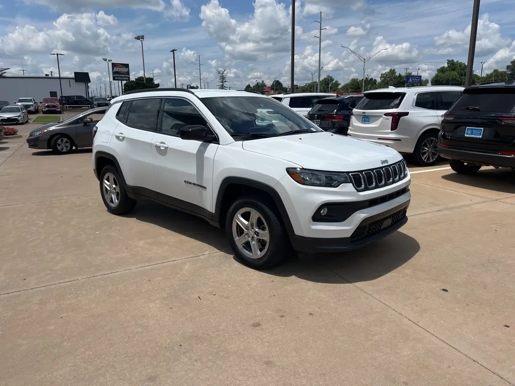 The 2024 Jeep Compass Latitude is a reliable SUV with a spacious interior and advanced safety features. It offers a comfortable driving experience with its smooth 8-speed automatic transmission. The exterior is finished in bright white clearcoat, making it stand out on the road.