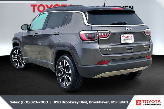 CARFAX One-Owner. Clean CARFAX. Visit Toyota of Brookhaven!! Toyota's 2024 Presidents Award Winner and Voted - Best Dealer of SW Mississippi for the past 7 years! We are proud to offer attractive 2024 Jeep Compass in Gray with the following features; Quick Order Package 29G Limited, 4WD, LED Low/Highbeam Projector Headlamps, Premium LED Fog Lamps, 10.1" Touchscreen Display, 3.73 Final Drive Ratio, 4-Wheel Disc Brakes, 4G LTE Wi-Fi Hot Spot, 6 Speakers, ABS brakes, Air Conditioning, Alloy wheels, AM/FM radio: SiriusXM, Auto High-beam Headlights, Auto-dimming Rear-View mirror, Automatic temperature control, Brake assist, Bumpers: body-color, Compass, Delay-off headlights, Disassociated Touchscreen Display, Driver door bin, Driver vanity mirror, Dual front impact airbags, Dual front side impact airbags, Electronic Stability Control, Emergency communication system: Jeep Connect, For Details, Visit DriveUconnect.com, For More Info, Call 800-643-2112, Four wheel independent suspension, Front anti-roll bar, Front Bucket Seats, Front Center Armrest w/Storage, Front dual zone A/C, Front fog lights, Front reading lights, Fully automatic headlights, Global Telematics Box Module (TBM), Heated door mirrors, Heated front seats, Heated steering wheel, Illuminated entry, Knee airbag, Leather Shift Knob, Leather steering wheel, Leatherette Seats, Low tire pressure warning, Occupant sensing airbag, Outside temperature display, Overhead airbag, Overhead console, Panic alarm, ParkView Rear Back-Up Camera, Passenger door bin, Passenger vanity mirror, Power door mirrors, Power driver seat, Power steering, Power windows, Radio: Uconnect 5 w/10.1" Display, Rain sensing wipers, Rear anti-roll bar, Rear seat center armrest, Rear window defroster, Rear window wiper, Remote keyless entry, Security system, SiriusXM Guardian - Included Trial (B), SiriusXM Radio Service, Speed control, Split folding rear seat, Spoiler, Steering wheel mounted audio controls, Tachometer, Telescoping steering wheel, Tilt steering wheel, Traction control, Trip computer, Turn signal indicator mirrors, Variably intermittent wipers, and Wheels: 18" x 7" Painted Diamond Cut Aluminum.