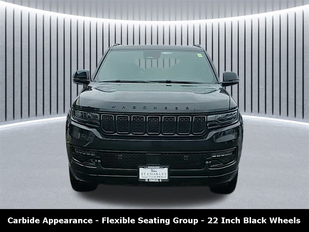 Clean Carfax. Apple CarPlay/Android Auto, Adaptive Cruise Control, Blind Spot Monitor, Cross Traffic Alert, Alloy Wheels / Premium Wheels, Heated Seats, Cooled Seats, Bluetooth, Hands Free, Brake Assist, Camera Backup, Chrome Wheels / Premium Wheels / Custome Whwels, Cruise Control, Heated Steering Wheel, Keyless Entry, Lane Departure Warning, Leather Seats, LED Headlights, Navigation System, Power Panoramic (Pano) Sunroof / Moonroof, Premium Sound System / Premium Audio, Roof Rack, Stability Control, Steering Wheel Controls, Sunroof/Moonroof, Third Row Seating / 3rd Row Seating, USB Port, Clean Carfax Accident Free History, Power Drivers Seat, Power Passenger Seat, Heated Rear Seats. The Carbide edition is distinguished by a darker, more aggressive look compared to base Wagoneer trims: Carbide appearance package with gloss-black exterior accents. 20â³ gloss-black painted alloy wheels (standard). Black trim elements and premium styling cues for a sportier presence on and off-road. Wagoneer Series II Carbide Appearance, 4D Sport Utility, 3.0L I6, 8-Speed Automatic, 4WD, Diamond Black Crystal Pearlcoat, Global Black w/Leather Trimmed Bucket Seats, 3 Panel Sunroof, 40/20/40 2nd Row Bench Power Tip/Slide, 60/40 Power Recline 3rd Row Seat, 8-Passenger Seating, Adjustable Roof Rail Crossbars, Black Interior Accents, Carbide Appearance Package, Cargo Cover, Flexible Seating Group, Full Length Floor Console.
