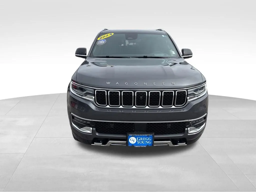 Experience the commanding presence of this 2024 Jeep Wagoneer Series III, a full-size SUV that blends luxury, performance, and advanced technology. With just over 14,600 miles, this Baltic Gray Metallic Clearcoat vehicle offers a spacious interior with black leather seats and seating for seven. Powered by a 3.0-liter twin-turbocharged V6 engine producing 420 horsepower and 468 lb-ft of torque, it delivers strong performance while maintaining 16 mpg city and 23 mpg highway. The 8-speed automatic transmission and 4WD drivetrain ensure smooth handling and off-road capability, making it versatile for city driving and outdoor adventures. Loaded with features like adaptive cruise control, Apple CarPlay, backup camera, blind spot monitor, Bluetooth, collision warning, cross traffic alert, hands-free liftgate, head-up display, heated seats, keyless entry, memory seats, navigation, premium audio, push start, rear A/C, rear heated seats, satellite radio, sunroof, third-row seating, tow package, Wi-Fi hotspot, and wireless phone charging, this Wagoneer offers comfort and connectivity for every journey. This used Wagoneer is equipped with a comprehensive safety suite to keep occupants protected. It features automatic emergency braking at the rear, a rear check rear seat reminder, dual front knee airbags, front and rear parking sensors, four-wheel ABS, emergency braking preparation, auto-locking power door locks, a rear camera system washer, and brake drying technology. These systems work together to prevent accidents and enhance driver confidence, making it a reliable choice for families and those prioritizing safety.
