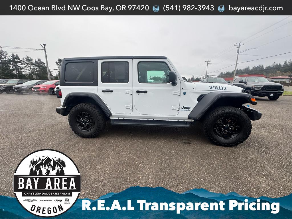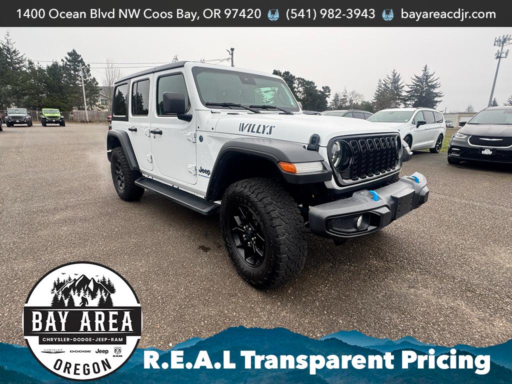 Discover the 2024 Jeep Wrangler 4xe Willys, a rugged 4WD plug-in hybrid awaiting you in Coos Bay, OR. This like-new PHEV pairs a spirited 2.0L 4-cylinder engine with electric drive for efficient performance and off-road capability, backed by a CARFAX 1-Owner history and remarkably low mileage—0 miles—so you get the latest technology and condition without the new-car price. Built for adventure, the Jeep Wrangler 4xe Willys features Apple CarPlay for seamless smartphone integration and Hands Free Bluetooth for safe, convenient calls and media control on the go. Enjoy confidence when reversing with the Back-Up Camera and maintain comfort in any climate with Automatic Climate Control. The Willys package adds tough, trail-ready styling and capability, while the plug-in hybrid system delivers strong torque and the option to drive on electric power for local trips. Located in Coos Bay, OR, this 4WD Wrangler is priced to move and confidently claims the best price in the area—a exceptional value for buyers seeking low mileage, advanced technology, and proven Jeep off-road performance. Whether you're exploring coastal trails or commuting with efficiency, this Jeep Wrangler 4xe Willys offers versatility, modern convenience, and a clean ownership record. Contact us to schedule a viewing and take advantage of this outstanding offer.