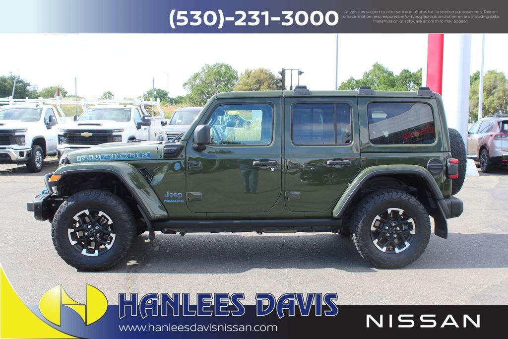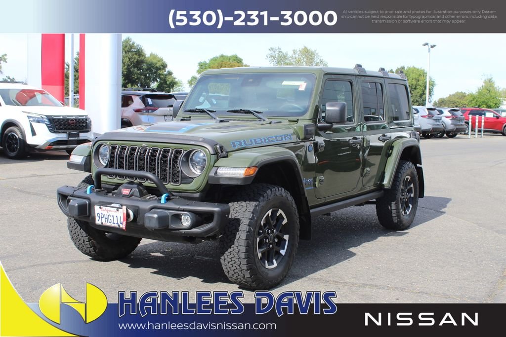 The 2024 Jeep Wrangler Rubicon X 4xe delivers the perfect mix of legendary off-road capability and modern plug-in hybrid performance. This 1-owner SUV with a clean CARFAX report is loaded with premium features, including the sought-after 29Y package. Inside, you'll enjoy heated Nappa leather seats, a premium audio system, and a large 12.3-inch touchscreen that keeps navigation, apps, and entertainment right at your fingertips. With the efficiency of the 4xe plug-in hybrid system and the rugged capability the Wrangler is known for, this Rubicon X is ready for both daily driving and serious adventure. Available now at Hanlees Davis Nissan come experience a Wrangler that combines luxury, technology, and trail-rated performance in one incredible package.