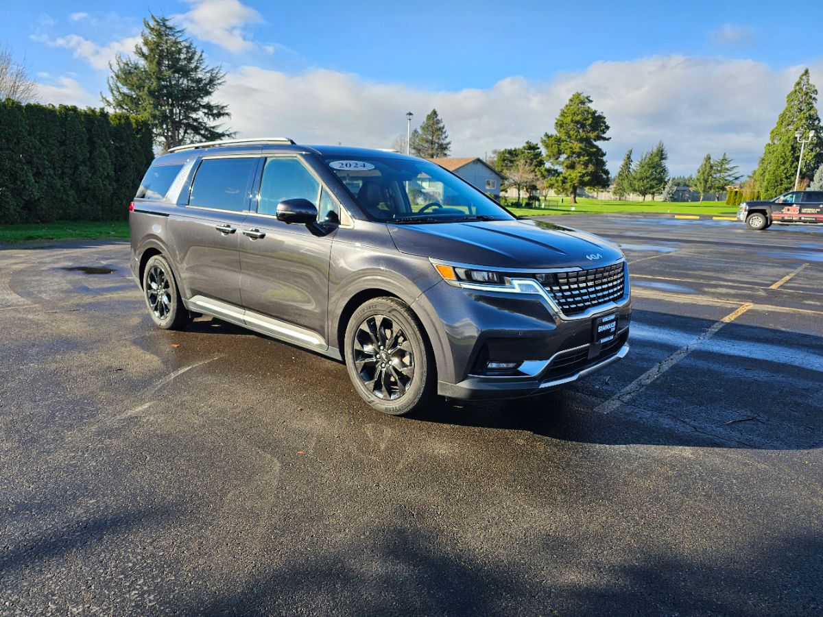 The clean title 2024 Kia Carnival SX FWD in the striking Panthera Metal exterior color is a remarkable blend of style and functionality. This minivan is powered by a robust 3.5L 6-cylinder engine, ensuring a smooth and responsive drive whether you're navigating city streets or cruising the highway. The stylish Astra Blue accents enhance its visual appeal, making it stand out in any parking lot. Inside, you'll find an inviting Gray interior, designed with both comfort and aesthetics in mind. The cabin is spacious, with advanced seating configurations to suit all your needs, complemented by the sought-after rear seat entertainment package. This feature keeps passengers entertained on long journeys, making the Carnival a perfect family vehicle. Included in the package is the convenient option group 015, which enhances your driving experience with cutting-edge technology and ease. The tow hitch (pnp) allows for additional utility, enabling you to bring along everything from bicycles to lightweight trailers with ease. Tailored for modern lifestyles, the 2024 Carnival SX FWD combines elegance with practicality, making it a versatile option for any discerning driver.