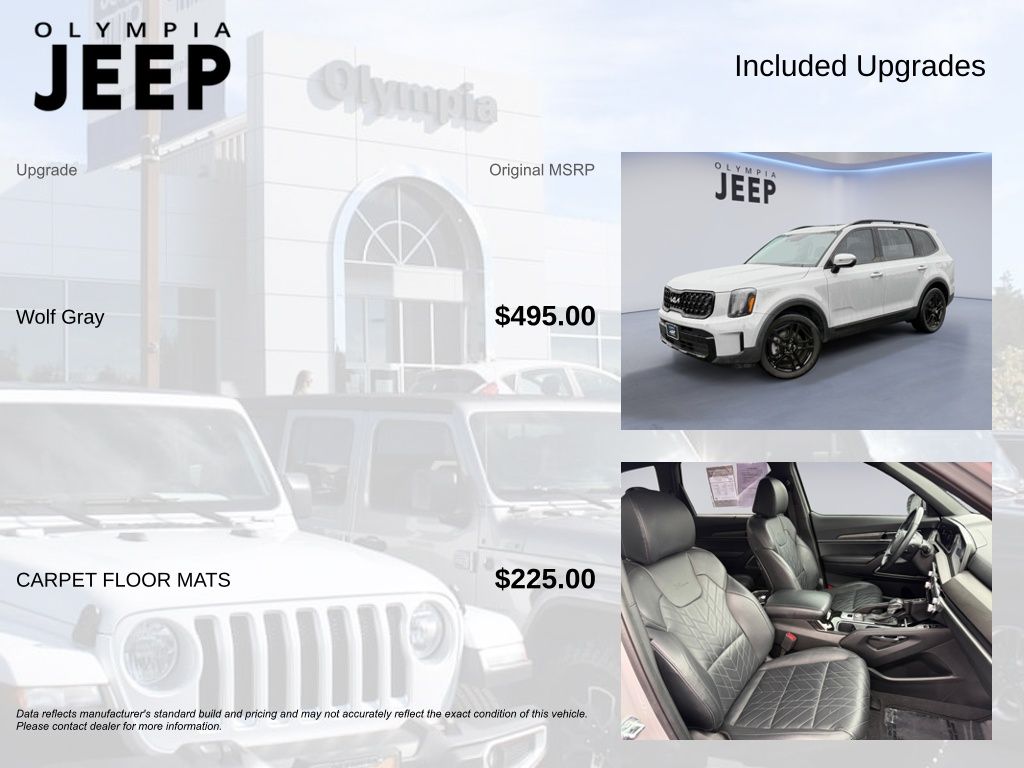 This vehicle is located at Olympia Jeep. Serving Olympia, Lacey, Tumwater, Shelton, Dupont, Tacoma, Yelm, Centralia, Chehalis. Discover the exceptional 2024 Kia Telluride EX X-Line, a remarkable SUV that redefines the driving experience. This stunning vehicle boasts a captivating exterior in the sophisticated Gray color, complemented by a wealth of premium features that elevate your journey to new heights. Powered by a robust 3.8L V6 DOHC engine and equipped with an 8-Speed Automatic transmission and All-Wheel Drive, the Telluride EX X-Line delivers exceptional performance and confidence on the road. With an impressive 18 MPG in the city and 24 MPG on the highway, this SUV offers a remarkable balance of power and efficiency. Step inside the Telluride EX X-Line and discover a cabin that exudes sophistication and comfort. The leather-wrapped steering wheel and shift knob provide a premium touch, while the heated and ventilated front seats ensure you and your passengers stay comfortable in any climate. The power driver's seat and power passenger seat allow for personalized adjustments, ensuring a tailored fit for every driver. The advanced technology features of the Telluride EX X-Line further enhance your driving experience. Enjoy the convenience of the Navigation System, the clarity of the 6-Speaker audio system, and the seamless integration of Apple CarPlay and Android Auto. The Smart Key with Push Button and Remote Start allows you to start your vehicle with the touch of a button.