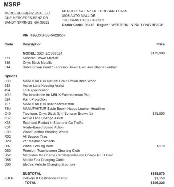 Step into the world of ultimate luxury with the 2024 Mercedes-Benz Maybach EQS 680, where SoCal sophistication meets the latest in cutting-edge technology, perfect for cruising along the coast or navigating the vibrant city streets. As you glide into the sumptuous interior, the rich Sonoran Brown leather seats embrace you, setting the stage for an extraordinary journey. The expansive panoramic roof invites the golden California sun to flood the interior, elevating your journey, while the intuitive navigation system effortlessly steers you through vibrant city streets and along breathtaking coastal highways. With Full-Time 4MATIC All-Wheel Drive, every drive is a testament to precision and control, ensuring that you navigate any terrain with confidence. The state-of-the-art DVD system transforms your travels into a cinematic experience, making every moment on the road a delight. This Maybach EQS 680 is not just a vehicle; its a sanctuary of luxury, designed for those who demand the finest in life. Experience the perfect blend of performance and elegance, where every detail is crafted to elevate your journey. Ready to redefine your driving experience? Visit us today at Mercedes-Benz of Thousand Oaks and discover how the Maybach EQS 680 can transform your travels into extraordinary adventures. According to Carfax's Vehicle History Report, this car is Accident-Free, had only one previous owner and is well-maintained (regular oil changes; general maintenance)!!